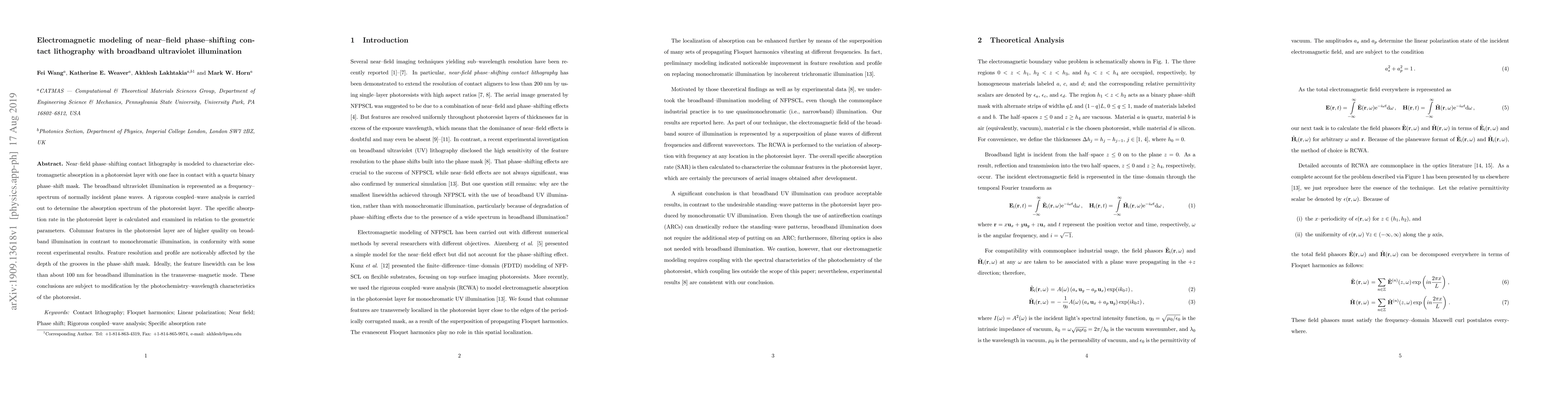 Near-field phase-shifting contact lithography is modeled to characterize electromagnetic absorption in a photoresist layer with one face in contact with a quartz binary phase-shift mask. The broadband ultraviolet illumination is represented as a frequency-spectrum of normally incident plane waves. A rigorous coupled-wave analysis is carried out to determine the absorption spectrum of the photoresist layer. The specific absorption rate in the photoresist layer is calculated and examined in relation to the geometric parameters. Columnar features in the photoresist layer are of higher quality on broadband illumination in contrast to monochromatic illumination, in conformity with some recent experimental results. Feature resolution and profile are noticeably affected by the depth of the grooves in the phase-shift mask. Ideally, the feature linewidth can be less than about 100 nm for broadband illumination in the transverse-magnetic mode. These conclusions are subject to modification by the photochemistry-wavelength characteristics of the photoresist.