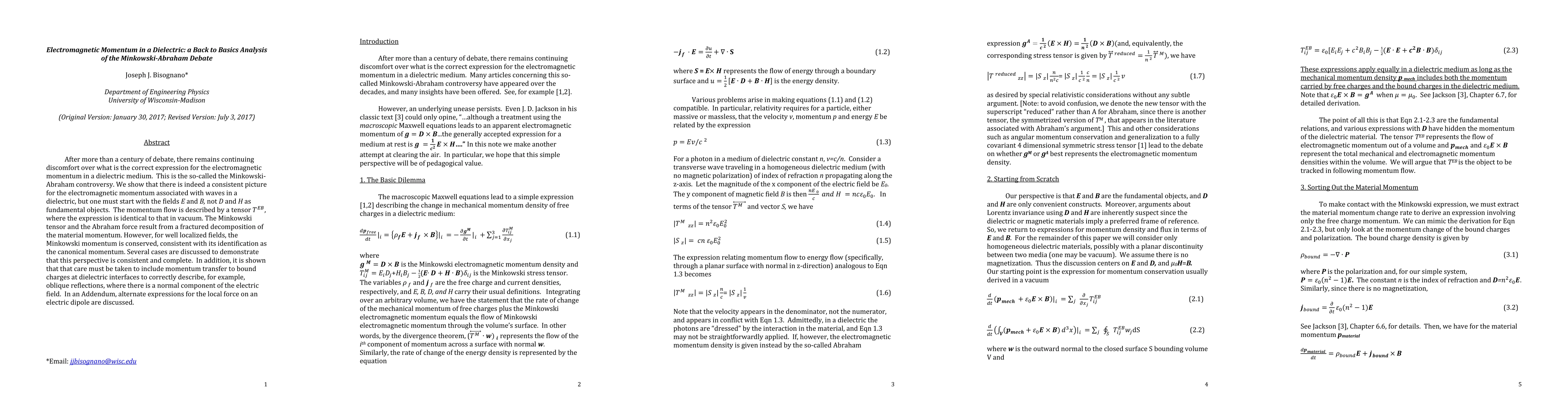 This paper resolves the century-old Minkowski-Abraham debate by asserting that electromagnetic momentum in a dielectric should be derived from fundamental E and B fields, leading to a tensor T^EB identical to that in vacuum. It emphasizes the conservation of Minkowski momentum for localized fields and highlights the necessity of considering momentum transfer to bound charges for accurate descriptions of phenomena like oblique reflections.