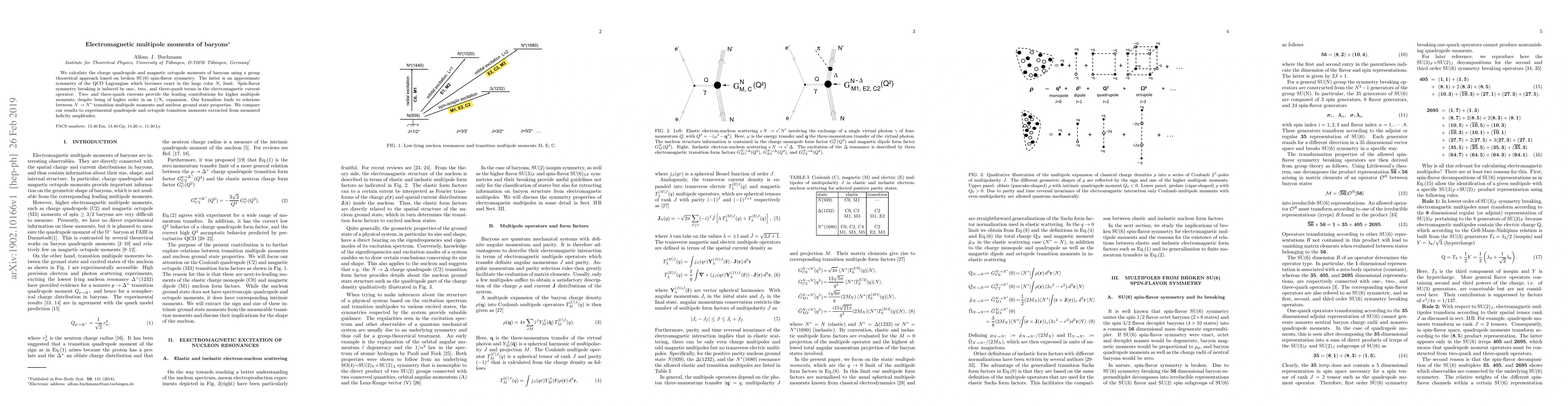 This study calculates the charge quadrupole and magnetic octupole moments of baryons via a group theoretical approach based on broken SU(6) spin-flavor symmetry, revealing relations between N --> N* transition multipole moments and nucleon properties, and comparing results with experimental data.