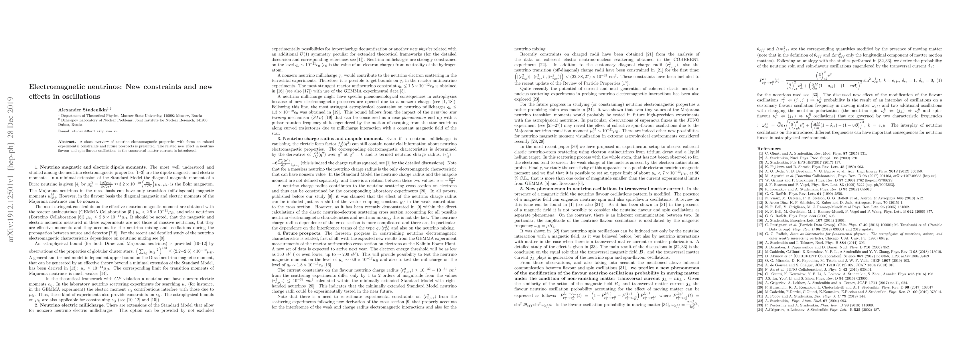 This paper reviews electromagnetic properties of neutrinos, highlighting current experimental constraints and future research directions. It also introduces a novel effect in neutrino oscillations influenced by transversal matter currents.