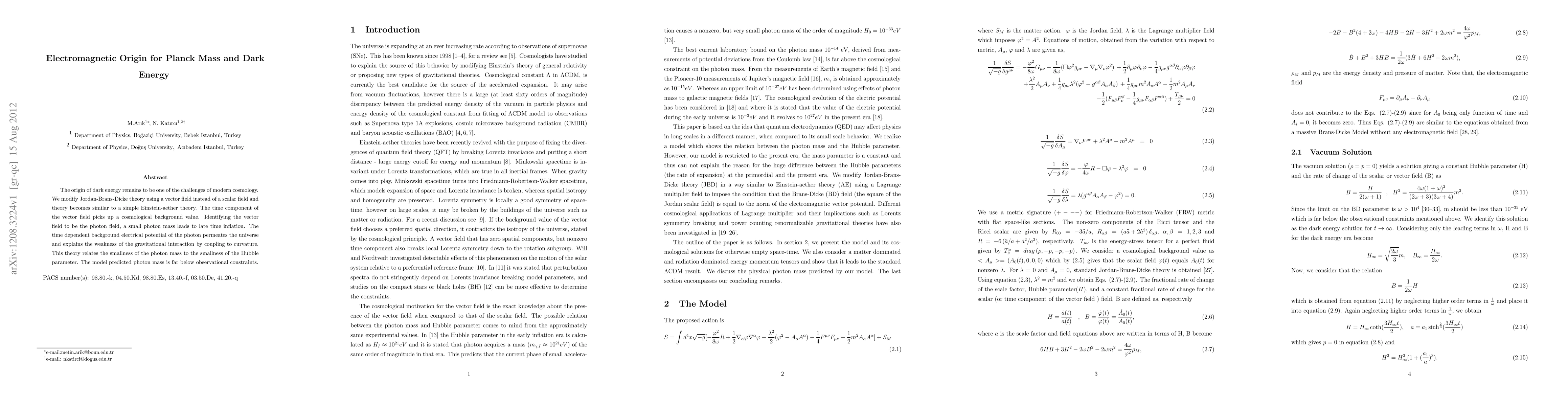 The origin of dark energy remains to be one of the challenges of modern cosmology. We modify Jordan-Brans-Dicke theory using a vector field instead of a scalar field and theory becomes similar to a simple Einstein-aether theory. The time component of the vector field picks up a cosmological background value. Identifying the vector field to be the photon field, a small photon mass leads to late time inflation. The time dependent background electrical potential of the photon permeates the universe and explains the weakness of the gravitational interaction by coupling to curvature. This theory relates the smallness of the photon mass to the smallness of the Hubble parameter. The model predicted photon mass is far below observational constraints.