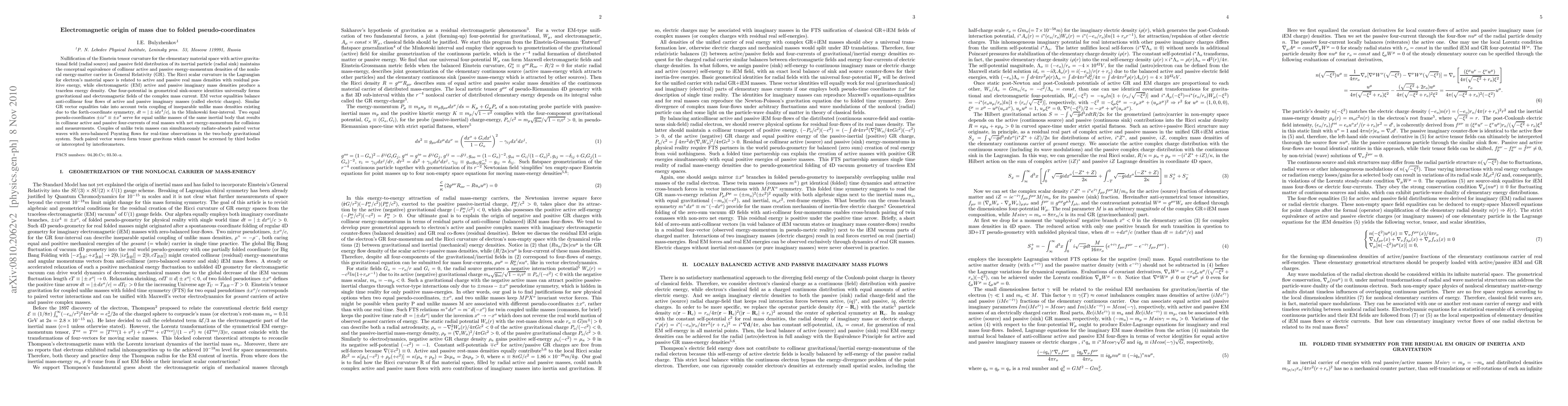 Nullification of the Einstein tensor curvature for the elementary material space with active gravitational field (radial source) and passive field distribution of its inertial particle (radial sink) maintains the conceptual equivalence of collinear active and passive energy-momentum densities of the nonlocal energy-matter carrier in General Relativity (GR). The Ricci scalar curvature in the Lagrangian for electron's material space is related to active and passive real mass densities with residual positive energy, while electromagnetic (EM) active and passive imaginary mass densities produce a traceless energy density. One four-potential in geometrical sink-source identities universally forms gravitational and electromagnetic fields of the complex mass current. EM vector equalities balance anti-collinear four flows of active and passive imaginary masses (called electric charges). Similar GR vector equalities take into account twin coupling of inseparable unlike mass densities existing due to the forth-coordinate symmetry, $ dt = |\pm idx^4/c|$, in the Minkowski four-interval. Two equal pseudo-coordinates $\pm ix^o\equiv \pm x^4 $ serve for equal unlike masses of the same inertial body that results in collinear active and passive four-currents of real masses with net energy-momentum for collisions and measurements. Couples of unlike twin masses can simultaneously radiate-absorb paired vector waves with zero-balanced Poynting flows for real-time observations in the two-body gravitational system. Such paired vector waves form tensor gravitons which cannot be screened by third bodies or intercepted by interferometers.