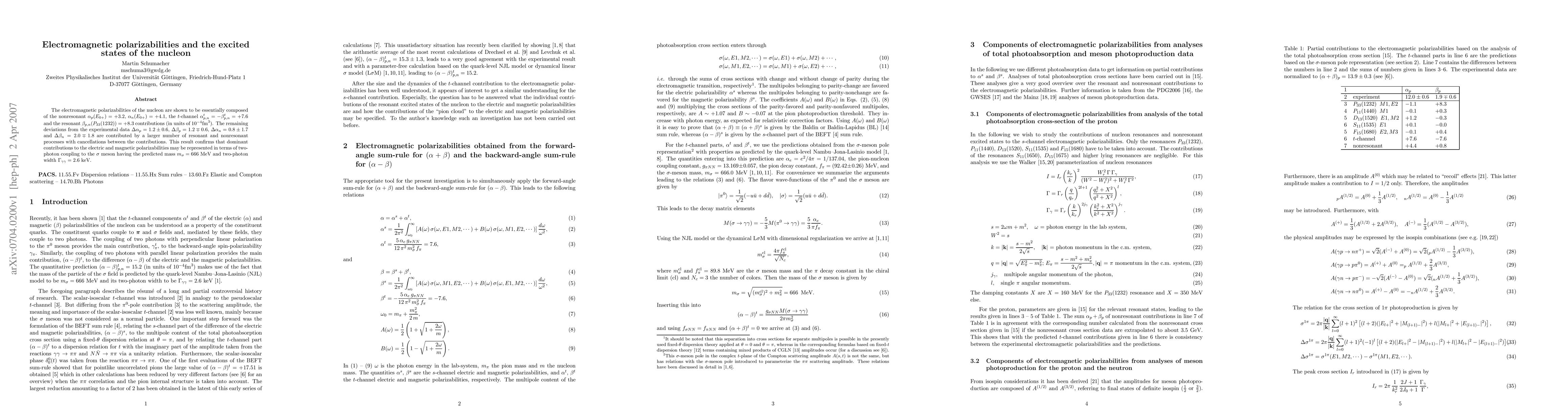 The electromagnetic polarizabilities of the nucleon are shown to be essentially composed of the nonresonant $\alpha_p(E_{0+})=+3.2$, $\alpha_n(E_{0+})=+4.1$,the $t$-channel $\alpha^t_{p,n}=-\beta^t_{p,n}=+7.6$ and the resonant $\beta_{p,n}(P_{33}(1232))=+8.3$ contributions (in units of $10^{-4}$fm$^3$. The remaining deviations from the experimental data $\Delta\alpha_p=1.2\pm 0.6$, $\Delta\beta_p=1.2\mp 0.6$, \Delta\alpha_n=0.8\pm 1.7$ and $\Delta\beta_n=2.0\mp 1.8$ are contributed by a larger number of resonant and nonresonant processes with cancellations between the contributions. This result confirms that dominant contributions to the electric and magnetic polarizabilities may be represented in terms of two-photon couplings to the $\sigma$-meson having the predicted mass $m_\sigma=666$ MeV and two-photon width $\Gamma_{\gamma\gamma}=2.6$ keV.