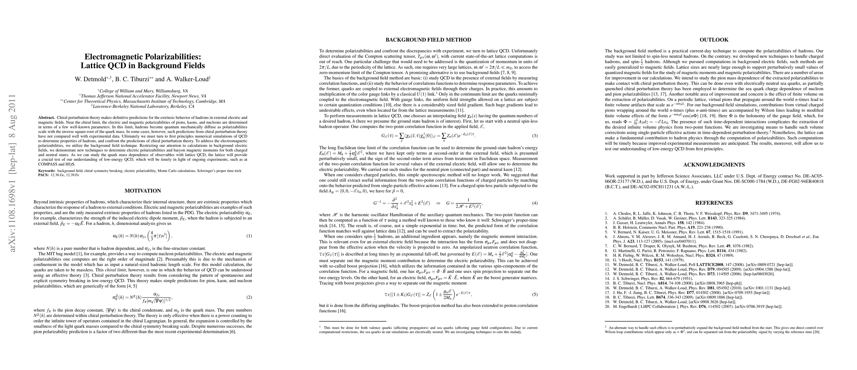 Chiral perturbation theory makes definitive predictions for the extrinsic behavior of hadrons in external electric and magnetic fields. Near the chiral limit, the electric and magnetic polarizabilities of pions, kaons, and nucleons are determined in terms of a few well-known parameters. In this limit, hadrons become quantum mechanically diffuse as polarizabilities scale with the inverse square-root of the quark mass. In some cases, however, such predictions from chiral perturbation theory have not compared well with experimental data. Ultimately we must turn to first principles numerical simulations of QCD to determine properties of hadrons, and confront the predictions of chiral perturbation theory. To address the electromagnetic polarizabilities, we utilize the background field technique. Restricting our attention to calculations in background electric fields, we demonstrate new techniques to determine electric polarizabilities and baryon magnetic moments for both charged and neutral states. As we can study the quark mass dependence of observables with lattice QCD, the lattice will provide a crucial test of our understanding of low-energy QCD, which will be timely in light of ongoing experiments, such as at COMPASS and HI\gamma S.