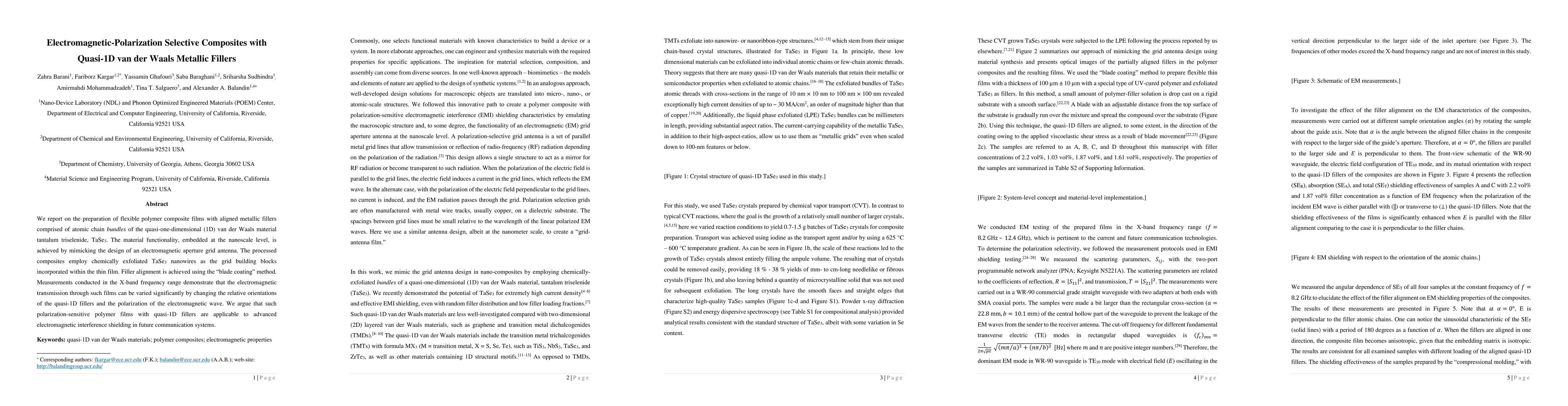This paper details the creation of flexible polymer composite films embedded with aligned quasi-1D van der Waals metallic fillers, specifically TaSe3 nanowires, which enable significant control over electromagnetic transmission based on polarization. The potential applications include advanced electromagnetic interference shielding in future communication systems.
