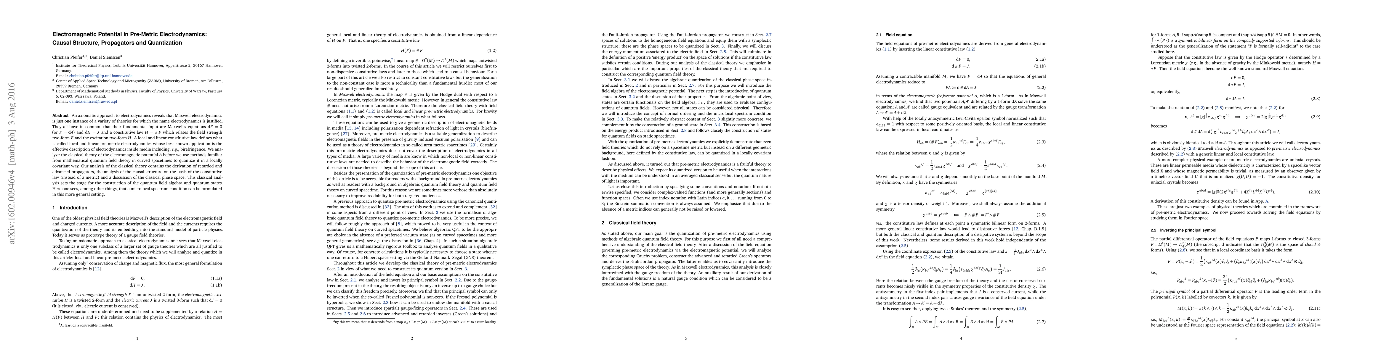This paper explores a pre-metric electrodynamics framework, deriving classical electromagnetic potential theories and analyzing their causal structures and propagators without relying on a metric. The study culminates in a locally covariant quantization method, revealing a microlocal spectrum condition applicable to this broader electrodynamic theory.