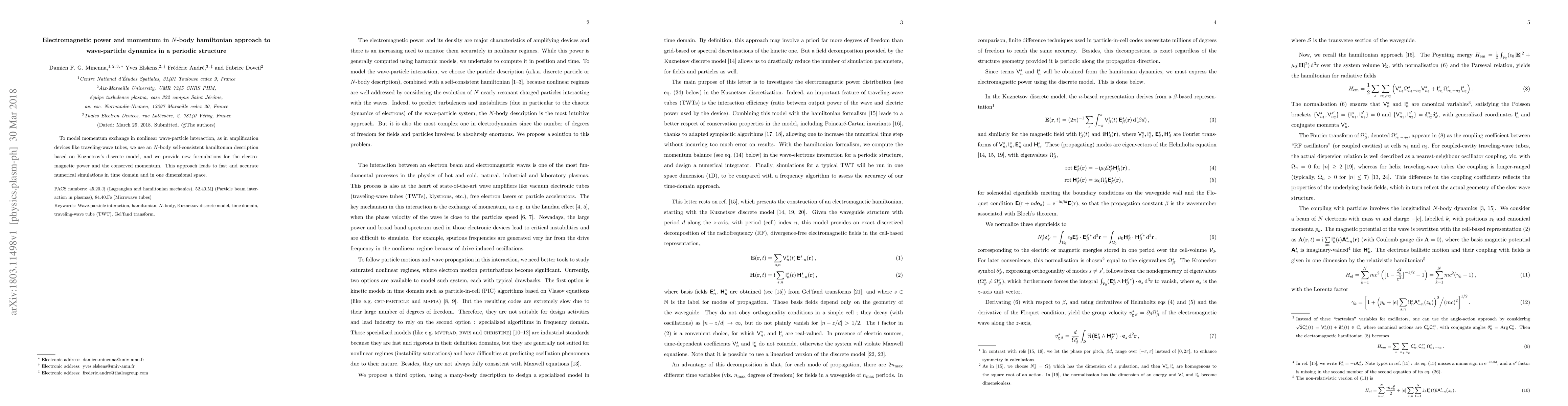 To model momentum exchange in nonlinear wave-particle interaction, as in amplification devices like traveling-wave tubes, we use an $N$-body self-consistent hamiltonian description based on Kuznetsov's discrete model, and we provide new formulations for the electromagnetic power and the conserved momentum. This approach leads to fast and accurate numerical simulations in time domain and in one dimensional space.