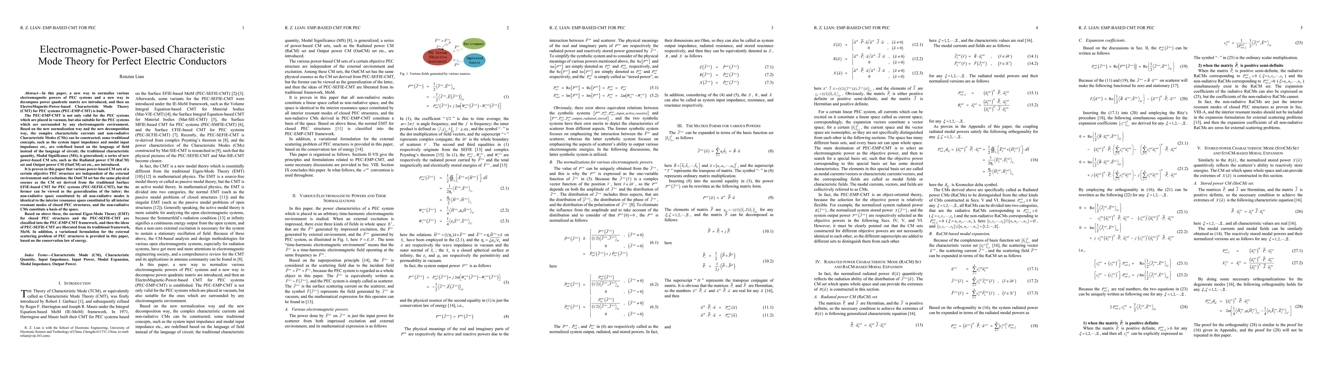 This paper develops an Electromagnetic-Power-based Characteristic Mode Theory (PEC-EMP-CMT) for perfect electric conductors (PECs), redefining traditional concepts and introducing new power-based CM sets. It proves that various power-based CM sets are independent of external environment and excitation, and classifies normal Eigen-Mode Theory within the PEC-EMP-CMT framework.