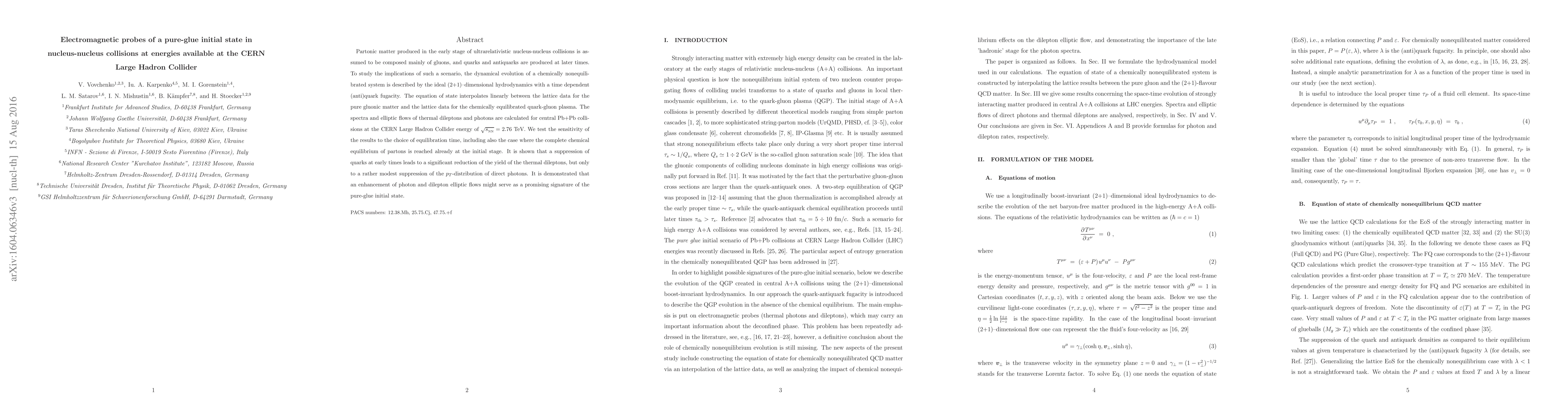 Partonic matter produced in the early stage of ultrarelativistic nucleus-nucleus collisions is assumed to be composed mainly of gluons, and quarks and antiquarks are produced at later times. To study the implications of such a scenario, the dynamical evolution of a chemically nonequilibrated system is described by the ideal (2+1)-dimensional hydrodynamics with a time dependent (anti)quark fugacity. The equation of state interpolates linearly between the lattice data for the pure gluonic matter and the lattice data for the chemically equilibrated quark-gluon plasma. The spectra and elliptic flows of thermal dileptons and photons are calculated for central Pb+Pb collisions at the CERN Large Hadron Collider energy of $\sqrt{s_{_{\rm NN}}} = 2.76$ TeV. We test the sensitivity of the results to the choice of equilibration times, including also the case where the complete chemical equilibrium of partons is reached already at the initial stage. It is shown that a suppression of quarks at early times leads to a significant reduction of the yield of the thermal dileptons, but only to a rather modest suppression of the $p_T$-distribution of direct photons. It is demonstrated that an enhancement of photon and dilepton elliptic flows might serve as a promising signature of the pure-glue initial state.