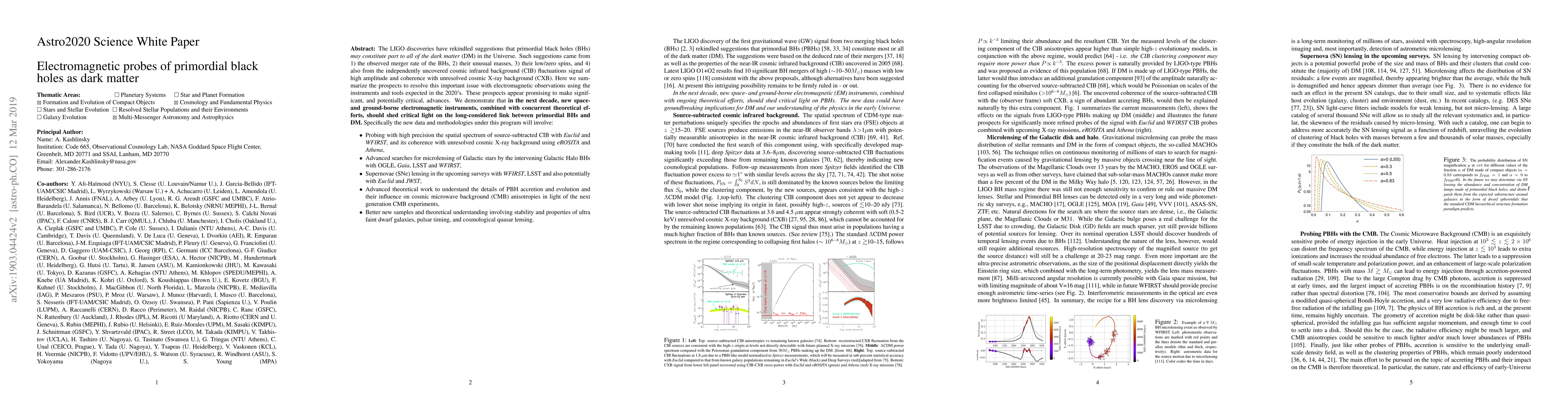 The paper discusses the potential of electromagnetic observations in the 2020s to shed light on the hypothesis that primordial black holes (PBHs) could constitute dark matter. It outlines specific methodologies involving instruments like Euclid, WFIRST, eROSITA, Athena, OGLE, Gaia, LSST, and upcoming surveys with WFIRST, LSST, and JWST. The proposed approaches include probing the spatial spectrum of source-subtracted cosmic infrared background, microlensing searches, supernovae lensing studies, theoretical work on PBH accretion and CMB anisotropies, and analysis of ultra faint dwarf galaxies, pulsar timing, and cosmological quasar lensing.