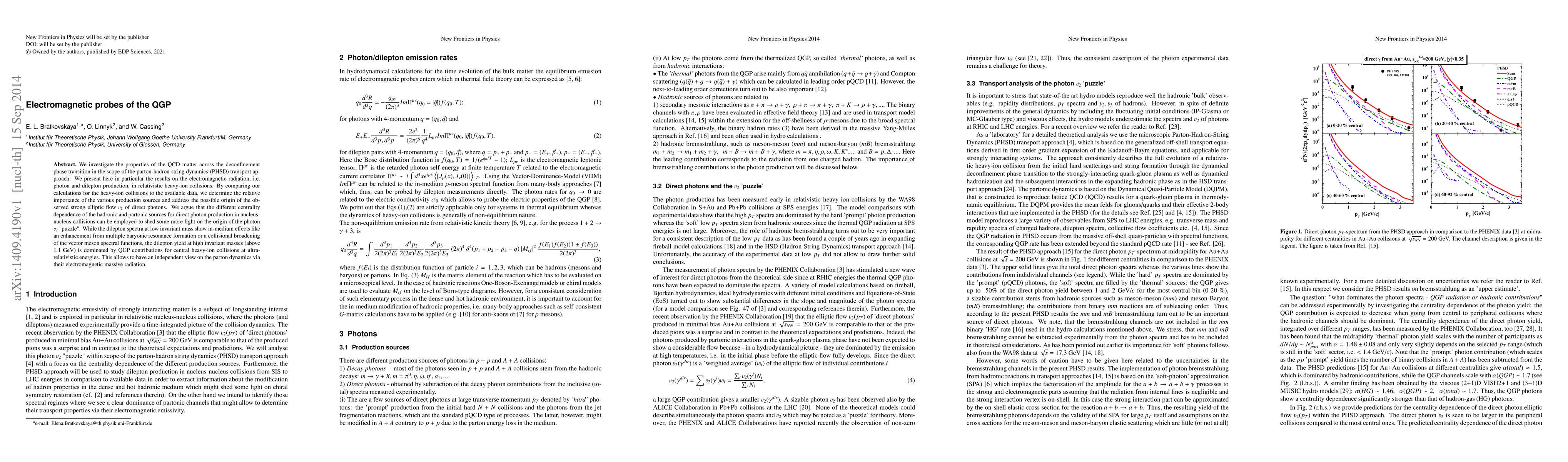 We investigate the properties of the QCD matter across the deconfinement phase transition in the scope of the parton-hadron string dynamics (PHSD) transport approach. We present here in particular the results on the electromagnetic radiation, i.e. photon and dilepton production, in relativistic heavy-ion collisions. By comparing our calculations for the heavy-ion collisions to the available data, we determine the relative importance of the various production sources and address the possible origin of the observed strong elliptic flow $v_2$ of direct photons. We argue that the different centrality dependence of the hadronic and partonic sources for direct photon production in nucleus-nucleus collisions can be employed to shed some more light on the origin of the photon $v_2$ "puzzle". While the dilepton spectra at low invariant mass show in-medium effects like an enhancement from multiple baryonic resonance formation or a collisional broadening of the vector meson spectral functions, the dilepton yield at high invariant masses (above 1.1 GeV) is dominated by QGP contributions for central heavy-ion collisions at ultra-relativistic energies. This allows to have an independent view on the parton dynamics via their electromagnetic massive radiation.