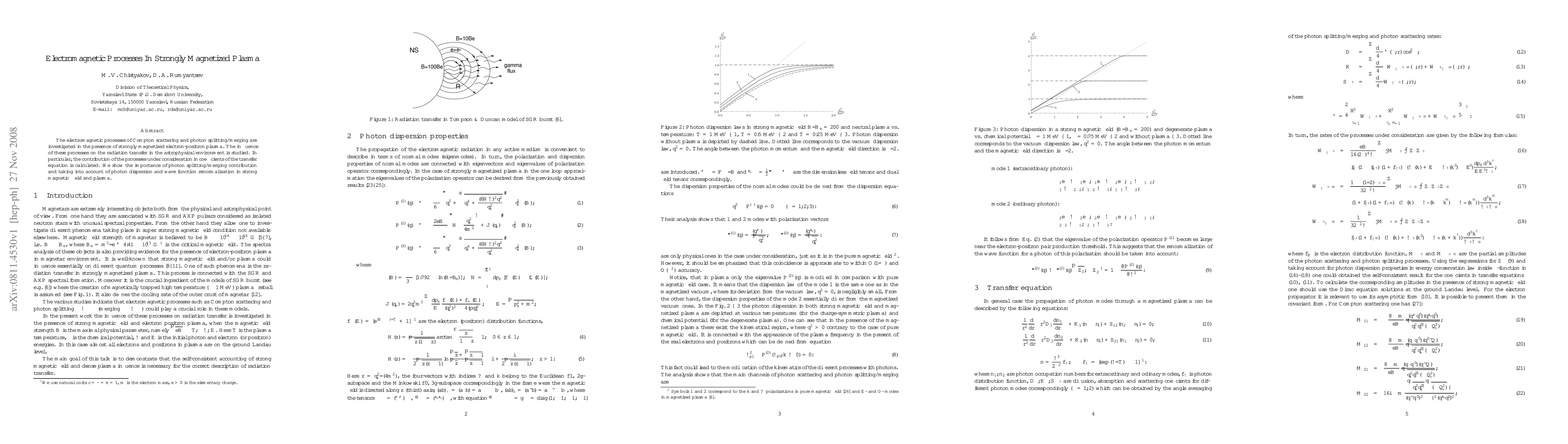 This paper investigates Compton scattering and photon splitting/merging in strongly magnetized electron-positron plasma, emphasizing their impact on radiation transfer in astrophysical environments. It highlights the significant role of photon splitting/merging and the necessity of considering photon dispersion and wave function renormalization in strong magnetic fields.