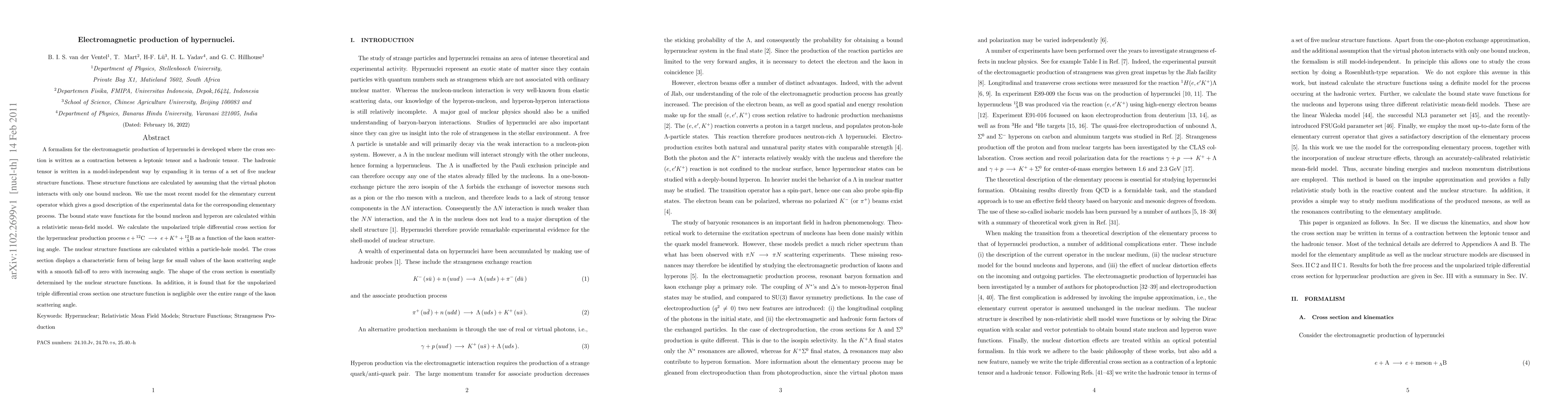 A formalism for the electromagnetic production of hypernuclei is developed where the cross section is written as a contraction between a leptonic tensor and a hadronic tensor. The hadronic tensor is written in a model-independent way by expanding it in terms of a set of five nuclear structure functions. These structure functions are calculated by assuming that the virtual photon interacts with only one bound nucleon. We use the most recent model for the elementary current operator which gives a good description of the experimental data for the corresponding elementary process. The bound state wave functions for the bound nucleon and hyperon are calculated within a relativistic mean-field model. We calculate the unpolarized triple differential cross section for the hypernuclear production process e + 12C --> e + K+ + 12_Lambda{B} as a function of the kaon scattering angle. The nuclear structure functions are calculated within a particle-hole model. The cross section displays a characteristic form of being large for small values of the kaon scattering angle with a smooth fall-off to zero with increasing angle. The shape of the cross section is essentially determined by the nuclear structure functions. In addition, it is found that for the unpolarized triple differential cross section one structure function is negligible over the entire range of the kaon scattering angle.