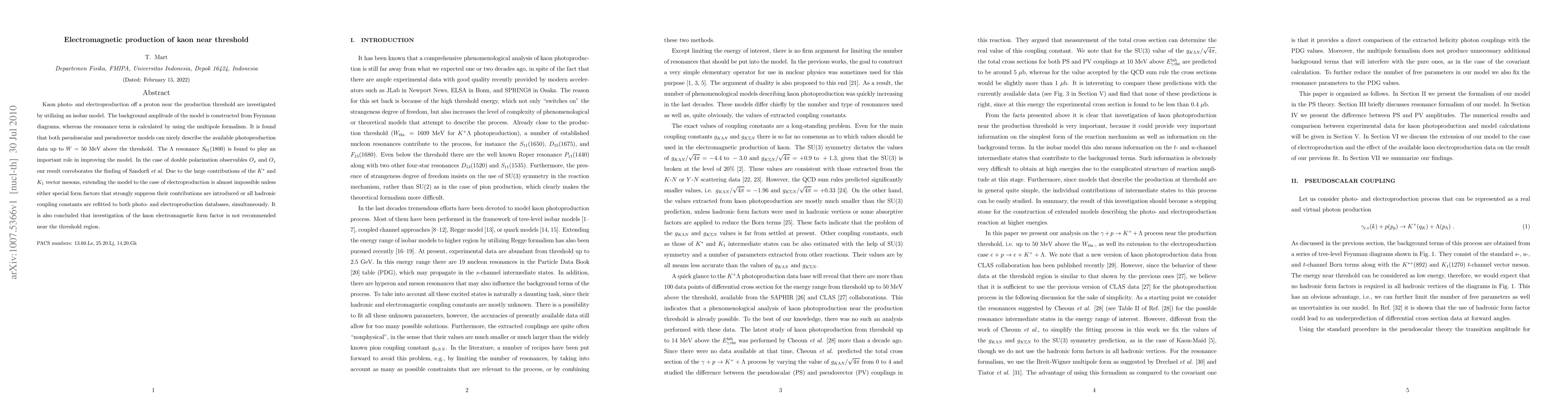 Kaon photo- and electroproduction off a proton near the production threshold are investigated by utilizing an isobar model. The background amplitude of the model is constructed from Feynman diagrams, whereas the resonance term is calculated by using the multipole formalism. It is found that both pseudoscalar and pseudovector models can nicely describe the available photoproduction data up to W = 50 MeV above the threshold. The Lambda resonance S_{01}(1800) is found to play an important role in improving the model. In the case of double polarization observables Ox and Oz our result corroborates the finding of Sandorfi et al. Due to the large contributions of the K* and K1 vector mesons, extending the model to the case of electroproduction is almost impossible unless either special form factors that strongly suppress their contributions are introduced or all hadronic coupling constants are refitted to both photo- and electroproduction databases, simultaneously. It is also concluded that investigation of the kaon electromagnetic form factor is not recommended near the threshold region.