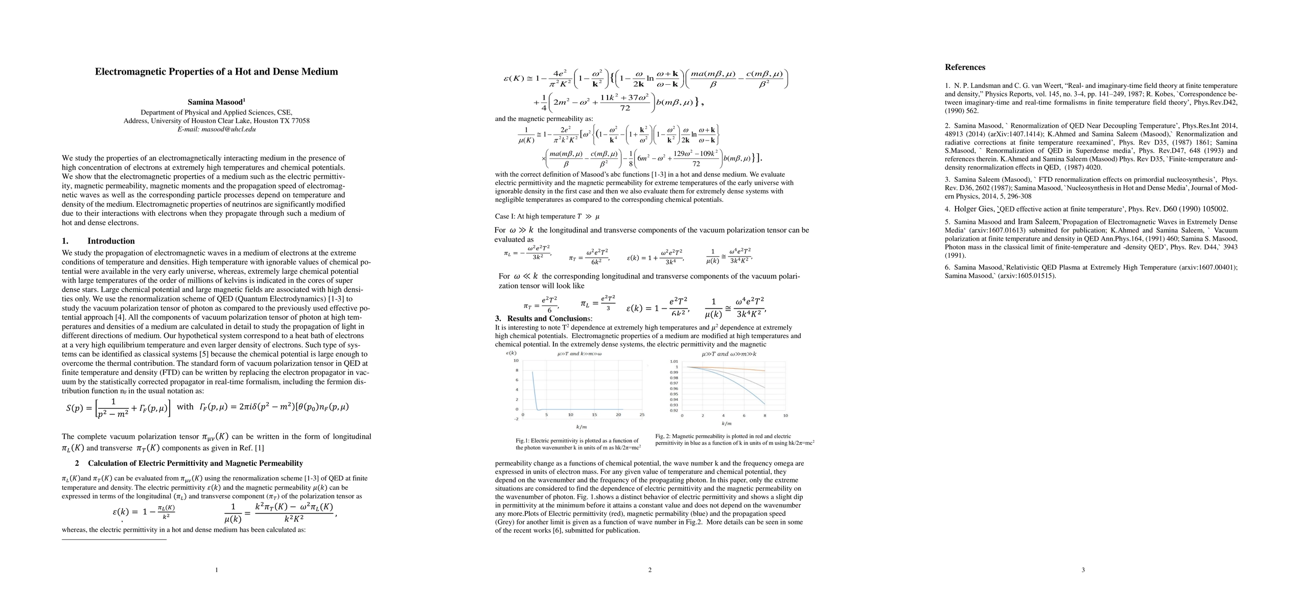 This research investigates how electromagnetic properties, including permittivity and permeability, change in a hot and dense medium with high electron concentration. It finds that these properties, along with wave propagation speeds and particle interactions, are significantly influenced by the medium's temperature and density, particularly affecting neutrinos' electromagnetic characteristics.