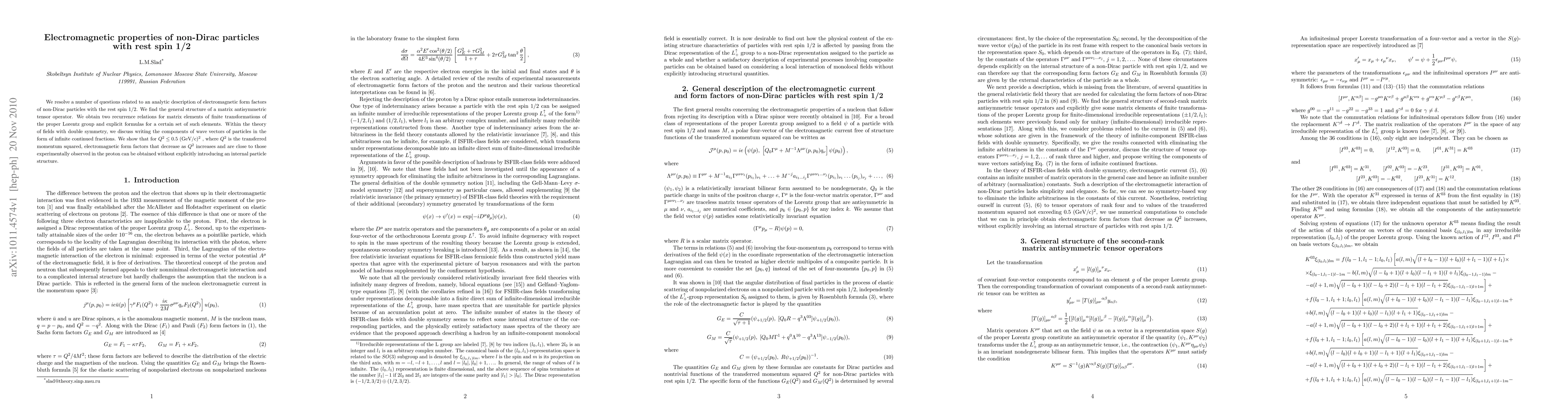 We resolve a number of questions related to an analytic description of electromagnetic form factors of non-Dirac particles with the rest spin 1/2. We find the general structure of a matrix antisymmetric tensor operator. We obtain two recurrence relations for matrix elements of finite transformations of the proper Lorentz group and explicit formulas for a certain set of such elements. Within the theory of fields with double symmetry, we discuss writing the components of wave vectors of particles in the form of infinite continued fractions. We show that for $Q^{2} \leq 0.5$ (GeV/c)$^{2}$, where $Q^{2}$ is the transferred momentum squared, electromagnetic form factors that decrease as $Q^{2}$ increases and are close to those experimentally observed in the proton can be obtained without explicitly introducing an internal particle structure.