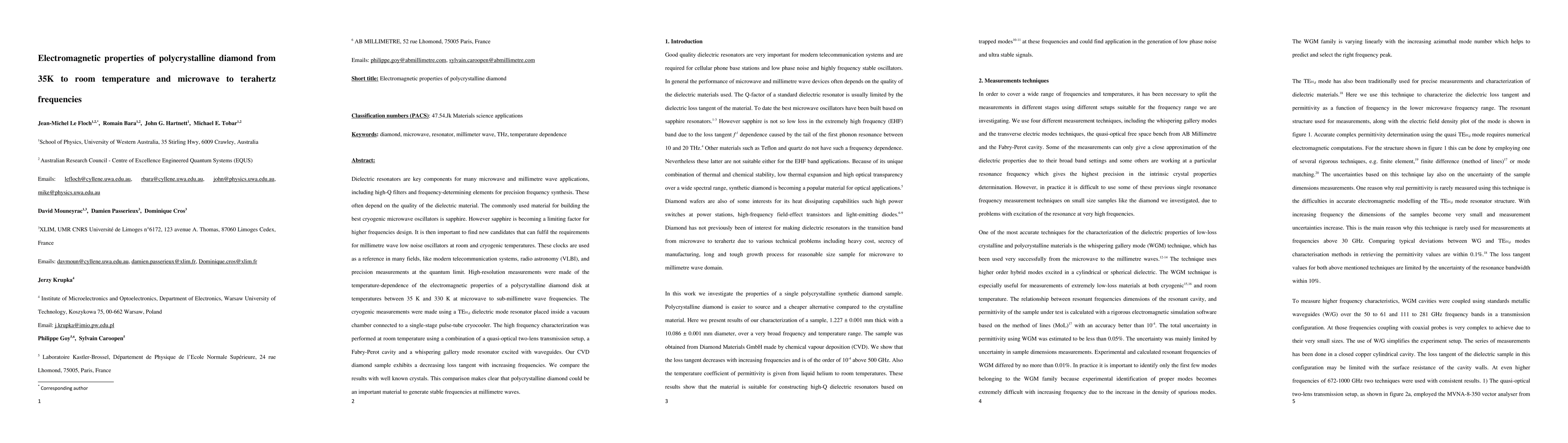 Dielectric resonators are key components for many microwave and millimetre wave applications, including high-Q filters and frequency-determining elements for precision frequency synthesis. These often depend on the quality of the dielectric material. The commonly used material for building the best cryogenic microwave oscillators is sapphire. However sapphire is becoming a limiting factor for higher frequencies design. It is then important to find new candidates that can fulfil the requirements for millimetre wave low noise oscillators at room and cryogenic temperatures. These clocks are used as a reference in many fields, like modern telecommunication systems, radio astronomy (VLBI), and precision measurements at the quantum limit. High-resolution measurements were made of the temperature-dependence of the electromagnetic properties of a polycrystalline diamond disk at temperatures between 35 K and 330 K at microwave to sub-millimetre wave frequencies. The cryogenic measurements were made using a TE01{\delta} dielectric mode resonator placed inside a vacuum chamber connected to a single-stage pulse-tube cryocooler. The high frequency characterization was performed at room temperature using a combination of a quasi-optical two-lens transmission setup, a Fabry-Perot cavity and a whispering gallery mode resonator excited with waveguides. Our CVD diamond sample exhibits a decreasing loss tangent with increasing frequencies. We compare the results with well known crystals. This comparison makes clear that polycrystalline diamond could be an important material to generate stable frequencies at millimetre waves.