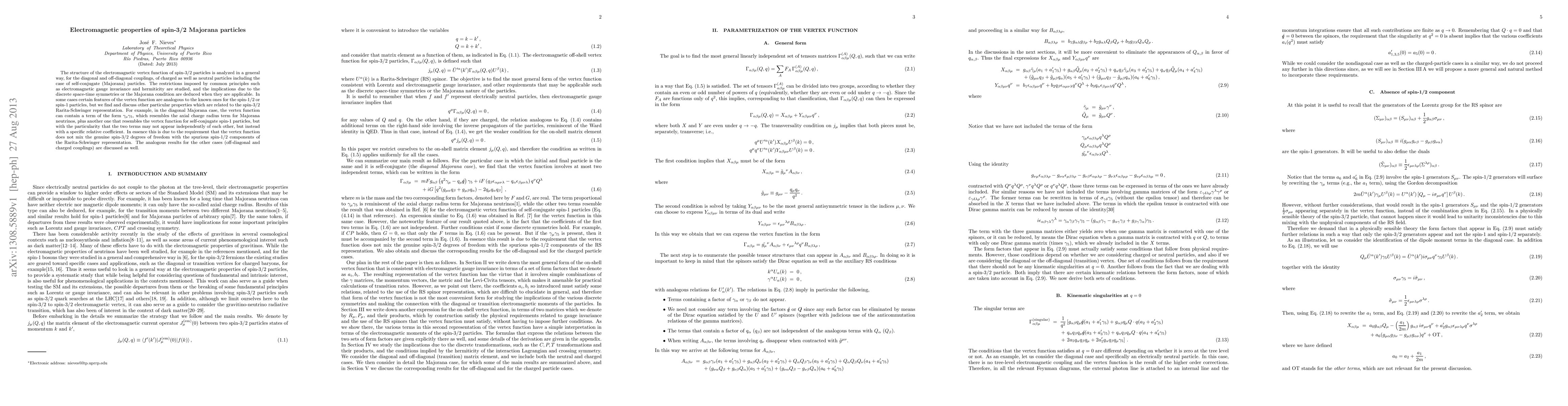 This paper analyzes the electromagnetic vertex function for spin-3/2 Majorana particles, focusing on both diagonal and off-diagonal couplings. It highlights unique properties arising from the Rarita-Schwinger representation, including a term resembling the axial charge radius for Majorana neutrinos.