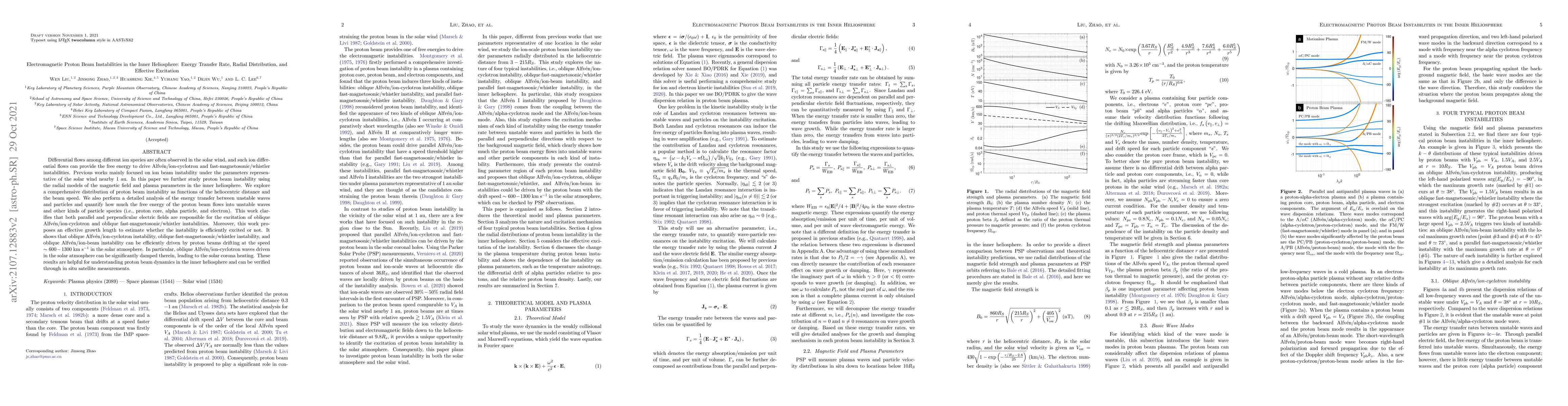 This paper investigates proton beam instabilities in the inner heliosphere, analyzing their energy transfer rates and radial distribution. It finds that oblique Alfv\'en/ion-cyclotron and fast-magnetosonic/whistler instabilities can be efficiently excited by proton beams at speeds of 600-1300 km s$^{-1}$, contributing to solar corona heating.