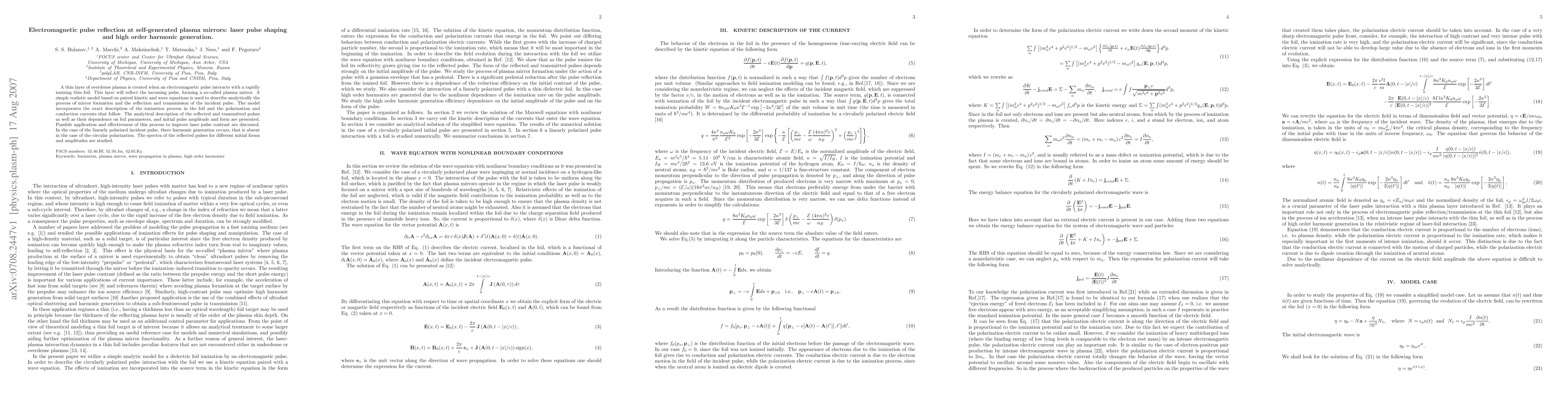 A thin layer of overdense plasma is created when an electromagnetic pulse interacts with a rapidly ionizing thin foil. This layer will reflect the incoming pulse, forming a so-called plasma mirror. A simple realistic model based on paired kinetic and wave equations is used to describe analytically the process of mirror formation and the reflection and transmission of the incident pulse. The model incorporates the exact description of the ionization process in the foil and the polarization and conduction currents that follow. The analytical description of the reflected and transmitted pulses as well as their dependence on foil parameters, and initial pulse amplitude and form are presented. Possible application and effectiveness of this process to improve laser pulse contrast are discussed. In the case of the linearly polarized incident pulse, there harmonic generation occurs, that is absent in the case of the circular polarization. The spectra of the reflected pulses for different initial forms and amplitudes are studied.