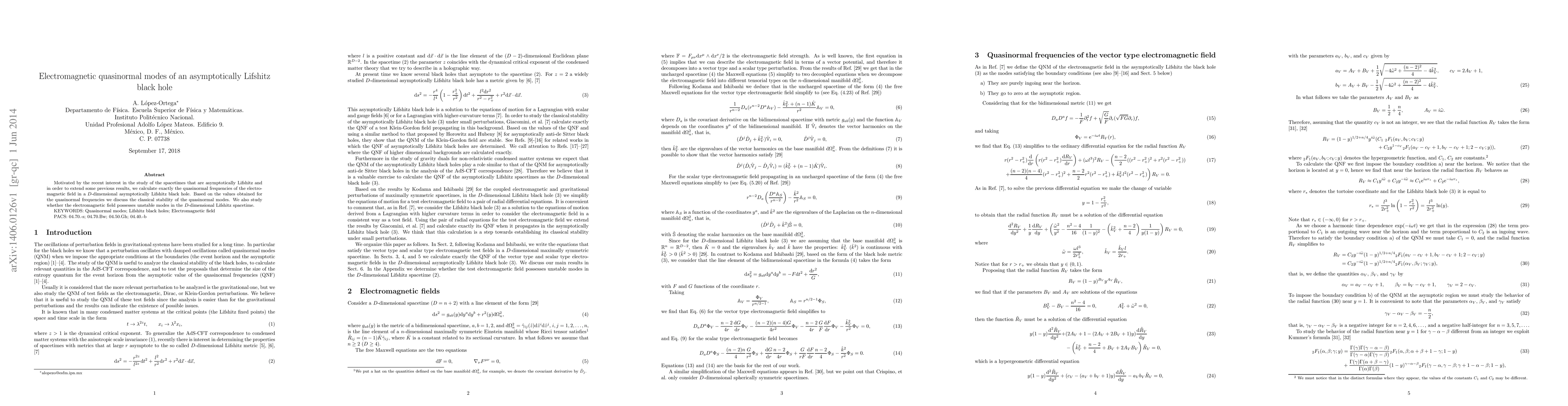This paper calculates the quasinormal frequencies of electromagnetic fields in D-dimensional asymptotically Lifshitz black holes, discussing the classical stability of these modes and investigating the presence of unstable electromagnetic modes in Lifshitz spacetime.