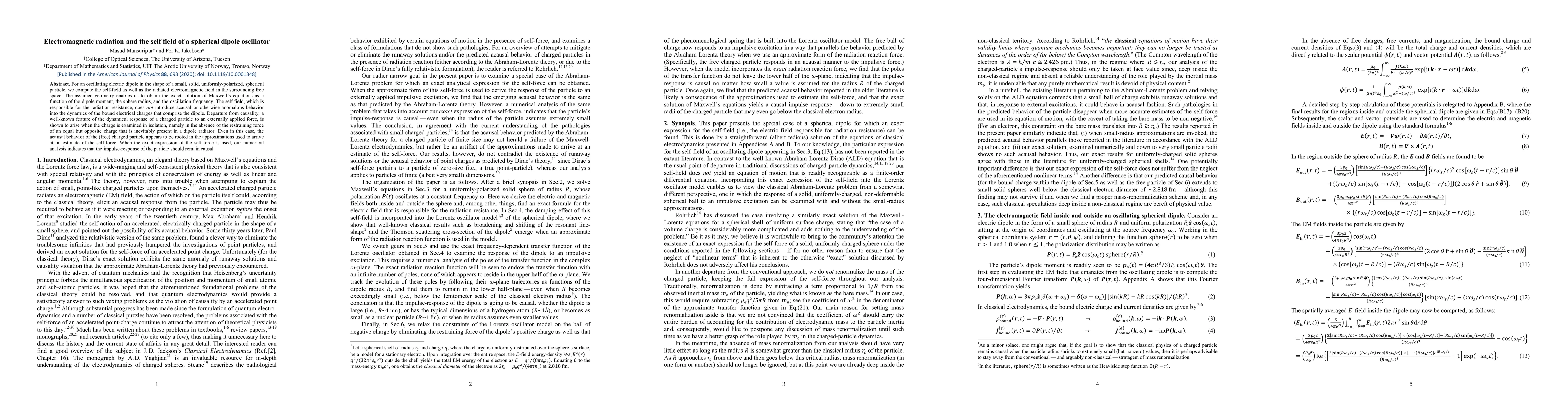 For an oscillating electric dipole in the shape of a small, solid, uniformly-polarized, spherical particle, we compute the self-field as well as the radiated electromagnetic field in the surrounding free space. The assumed geometry enables us to obtain the exact solution of Maxwell's equations as a function of the dipole moment, the sphere radius, and the oscillation frequency. The self field, which is responsible for the radiation resistance, does not introduce acausal or otherwise anomalous behavior into the dynamics of the bound electrical charges that comprise the dipole. Departure from causality, a well-known feature of the dynamical response of a charged particle to an externally applied force, is shown to arise when the charge is examined in isolation, namely in the absence of the restraining force of an equal but opposite charge that is inevitably present in a dipole radiator. Even in this case, the acausal behavior of the (free) charged particle appears to be rooted in the approximations used to arrive at an estimate of the self-force. When the exact expression of the self-force is used, our numerical analysis indicates that the impulse-response of the particle should remain causal.