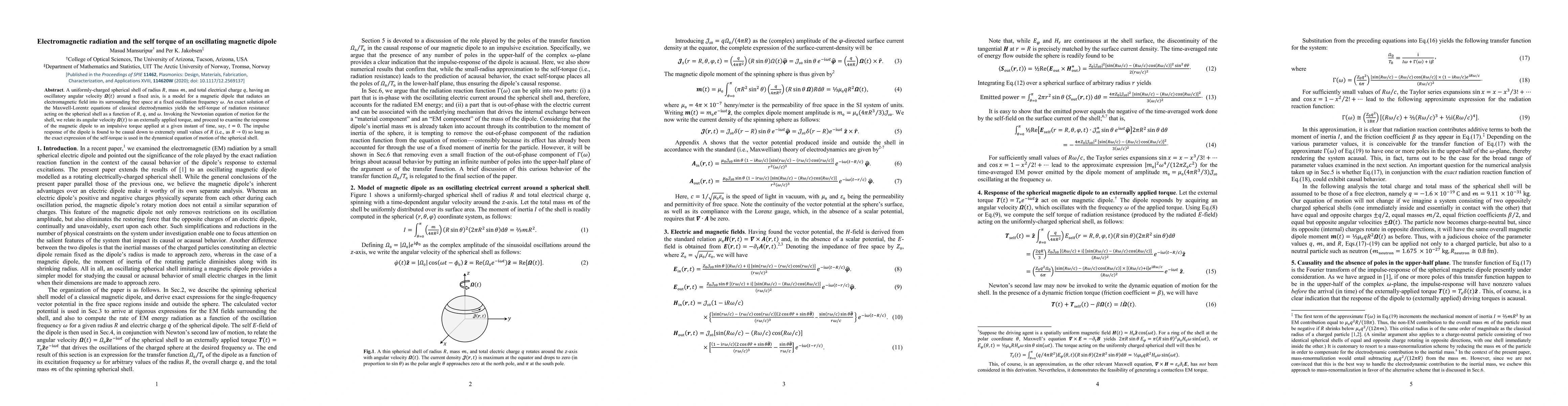 A uniformly-charged spherical shell of radius $R$, mass $m$, and total electrical charge $q$, having an oscillatory angular velocity $\Omega(t)$ around a fixed axis, is a model for a magnetic dipole that radiates an electromagnetic field into its surrounding free space at a fixed oscillation frequency $\omega$. An exact solution of the Maxwell-Lorentz equations of classical electrodynamics yields the self-torque of radiation resistance acting on the spherical shell as a function of $R$, $q$, and $\omega$. Invoking the Newtonian equation of motion for the shell, we relate its angular velocity $\Omega(t)$ to an externally applied torque, and proceed to examine the response of the magnetic dipole to an impulsive torque applied at a given instant of time, say, $t=0$. The impulse response of the dipole is found to be causal down to extremely small values of $R$ (i.e., as $R \to 0$) so long as the exact expression of the self-torque is used in the dynamical equation of motion of the spherical shell.