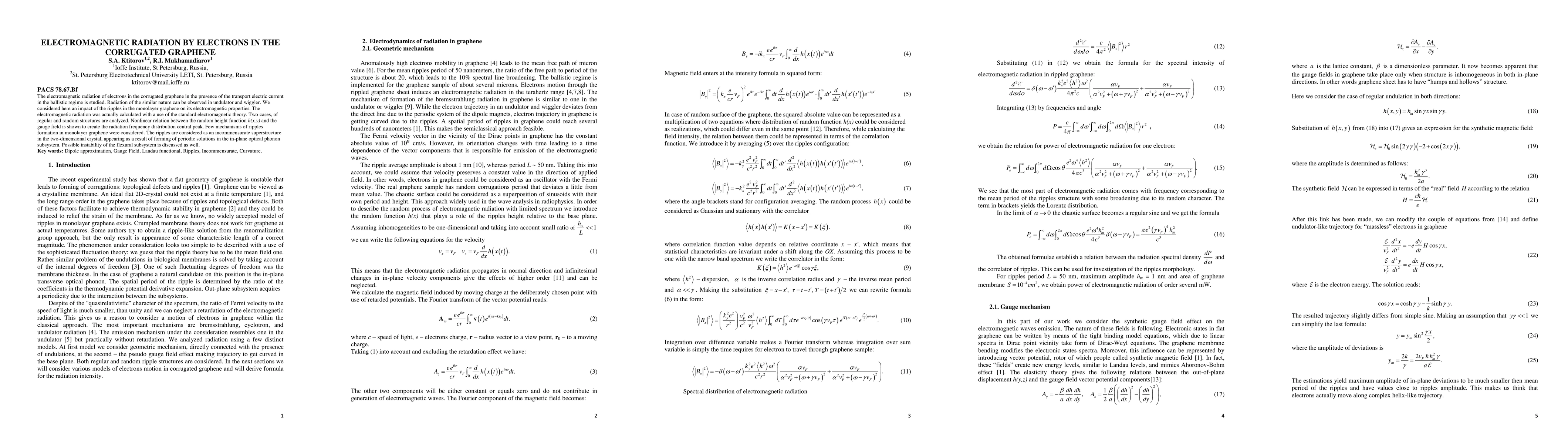 The electromagnetic radiation of electrons in the corrugated graphene in the presence of the transport electric current in the ballistic regime is studied. Radiation of the similar nature can be observed in undulator and wiggler. We considered here an impact of the ripples in the monolayer graphene on its electromagnetic properties. The electromagnetic radiation was actually calculated with a use of the standard electromagnetic theory. Two cases, of regular and random structures are analyzed. Nonlinear relation between the random height function h(x,y) and the gauge field is shown to create the radiation frequency distribution central peak. Few mechanisms of ripples formation in monolayer graphene were considered. The ripples are considered as an incommensurate superstructure in the two-dimensional crystal, appearing as a result of forming of periodic solutions in the in-plane optical phonon subsystem. Possible instability of the flexural subsystem is discussed as well.