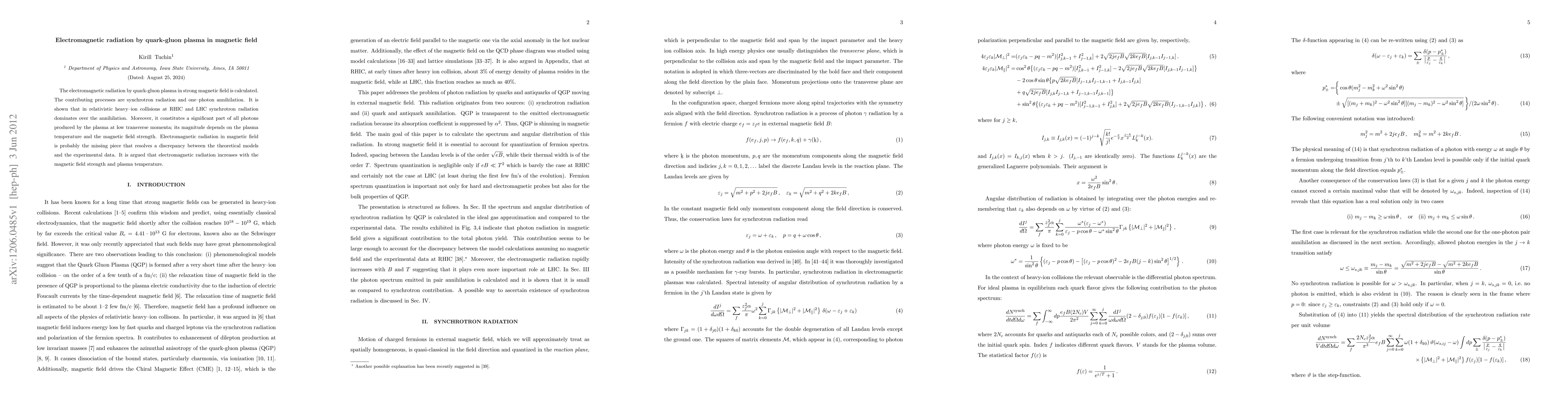 This paper calculates electromagnetic radiation from quark-gluon plasma in strong magnetic fields, showing synchrotron radiation dominates over one-photon annihilation in relativistic heavy-ion collisions. It suggests this radiation resolves discrepancies between theoretical models and experimental data, increasing with magnetic field strength and plasma temperature.