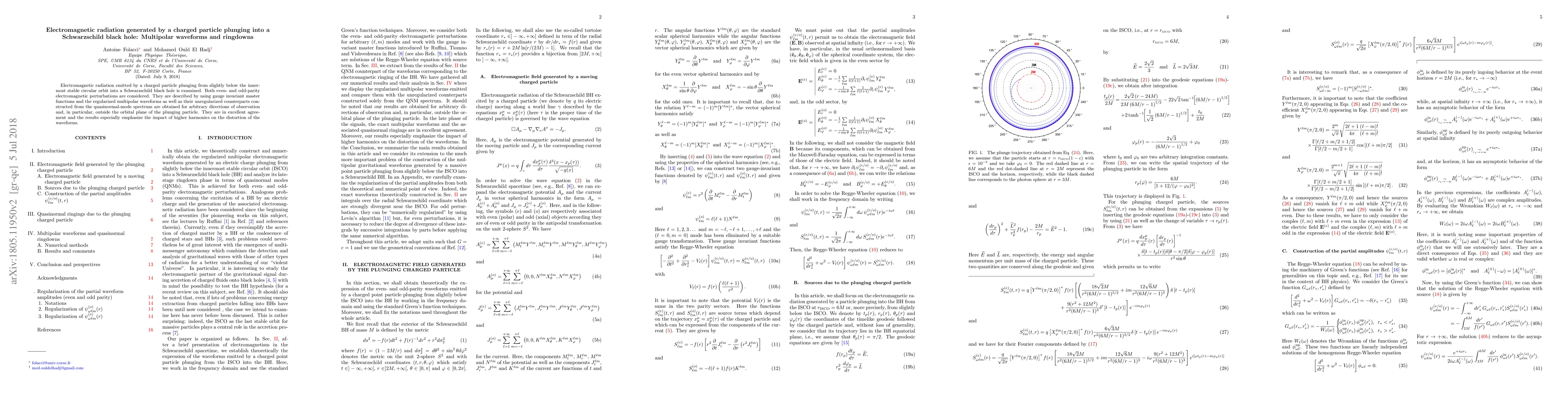 This paper investigates electromagnetic radiation from a charged particle falling into a Schwarzschild black hole, focusing on even- and odd-parity perturbations. It presents regularized and unregularized multipolar waveforms, highlighting the significant role of higher harmonics in waveform distortion.