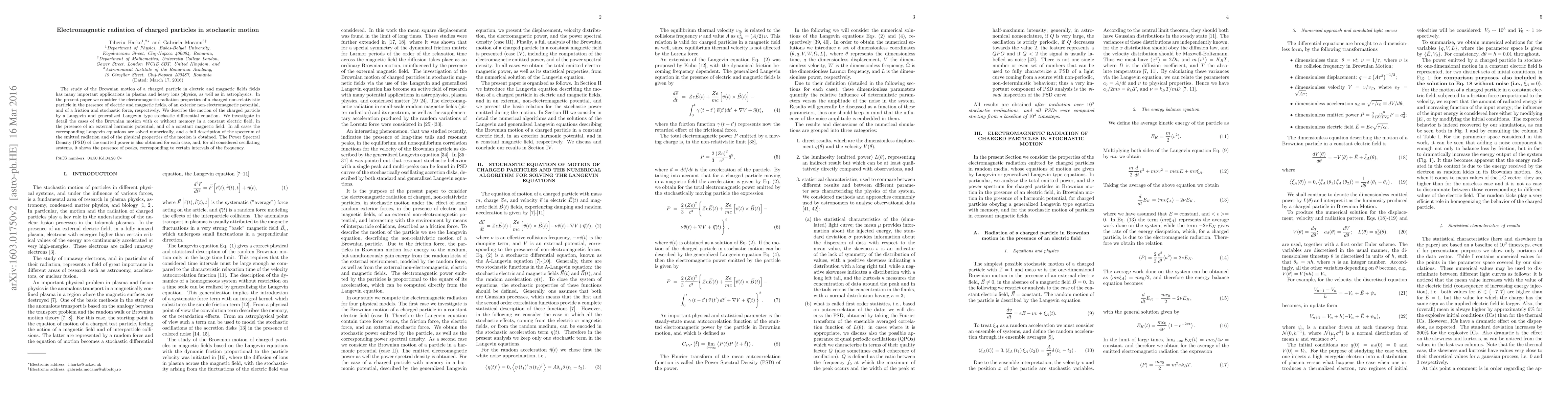 This paper investigates the electromagnetic radiation from charged particles undergoing Brownian motion in electric and magnetic fields, with stochastic forces and friction. Numerical solutions of Langevin equations reveal the spectrum of emitted radiation, showing frequency-specific peaks in the Power Spectral Density.