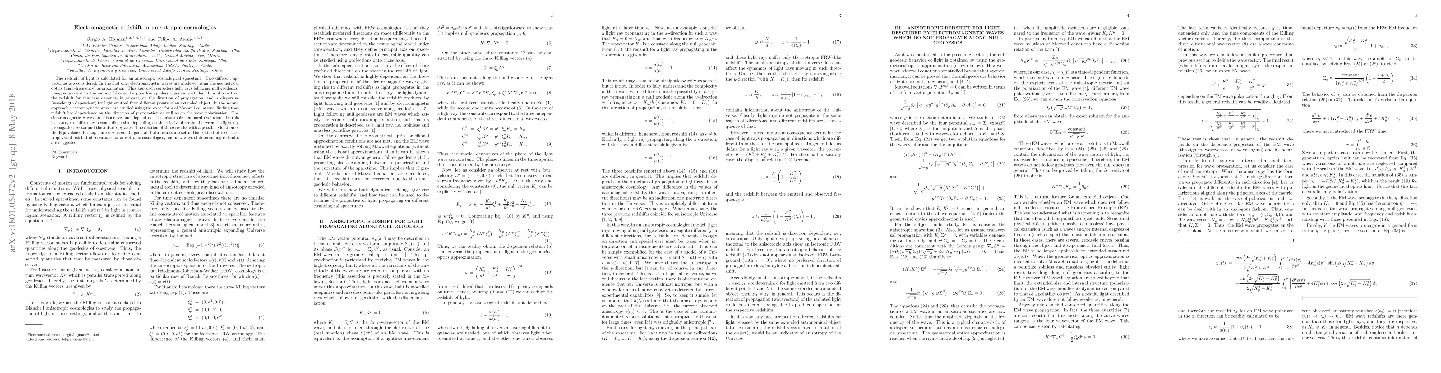 The redshift of light is calculated for an anisotropic cosmological spacetime. Two different approaches are considered. In the first one, electromagnetic waves are modeled using the geometrical optics (high--frequency) approximation. This approach considers light rays following null geodesics, being equivalent to the motion followed by pointlike spinless massless particles. It is shown that the redshift for this case depends, in general, on the direction of propagation, and is dispersive (wavelength dependent) for light emitted from different points of an extended object. In the second approach electromagnetic waves are studied using the exact form of Maxwell equations, finding that redshift has dependence on the direction of propagation as well as on the wave polarization. The electromagnetic waves are dispersive and depend on the anisotropic temporal evolution. In this last case, redshifts may become dispersive depending on the relative direction between the light ray propagation vector and the anisotropy axes. The relation of these results with a possible violation of the Equivalence Principle are discussed. In general, both results are set in the context of recent astrophysical redshift observations for anisotropic cosmologies, and new ways of determining redshifts are suggested.