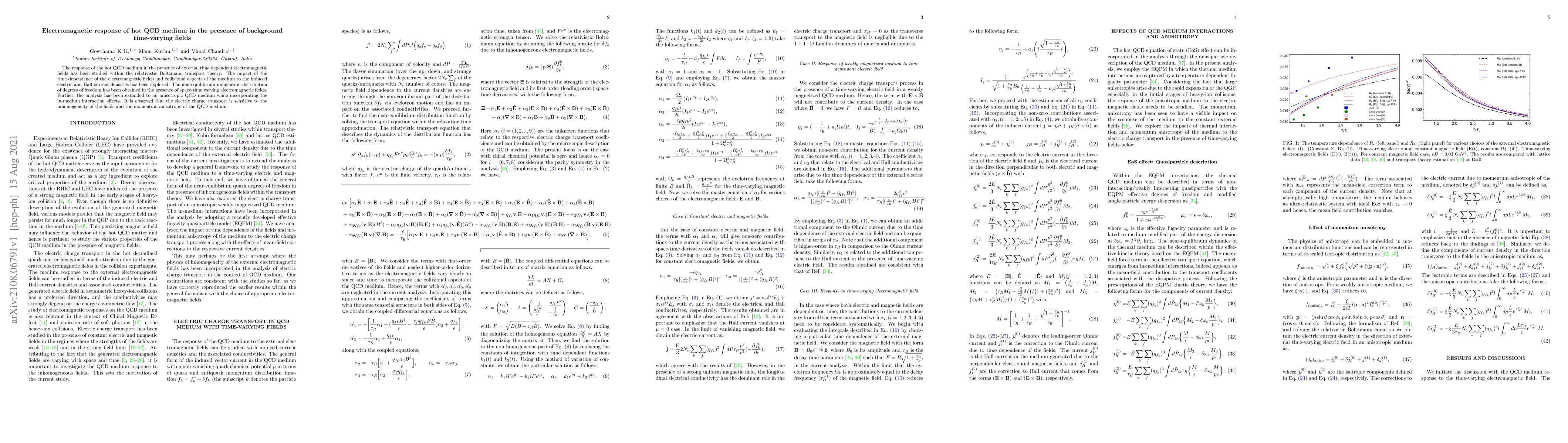 This study explores the electromagnetic response of hot QCD medium under time-varying fields using relativistic Boltzmann transport theory, revealing that electric charge transport is influenced by field inhomogeneity and momentum anisotropy, with an analysis extended to anisotropic QCD medium considering in-medium interactions.