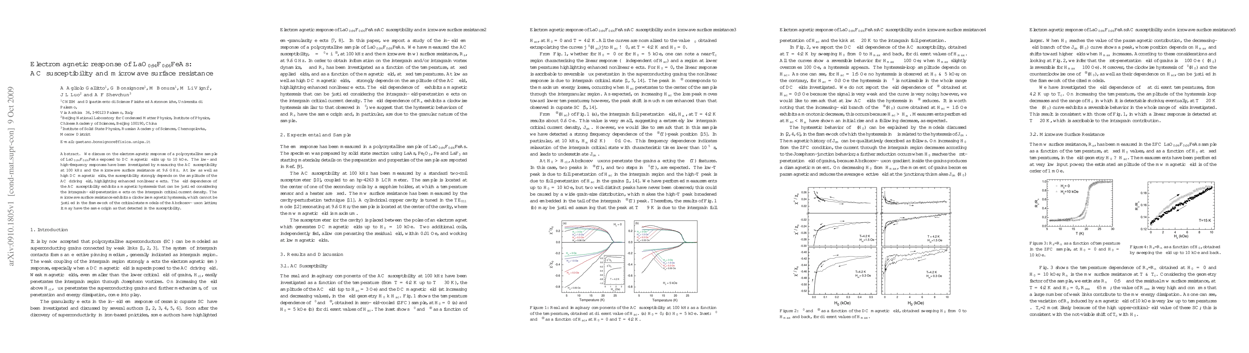 This study investigates the electromagnetic response of LaO_0.94F_0.06FeAs under DC magnetic fields, revealing strong nonlinear effects in AC susceptibility and a unique microwave surface resistance behavior with magnetic hysteresis, suggesting complex intragrain-field-penetration dynamics.