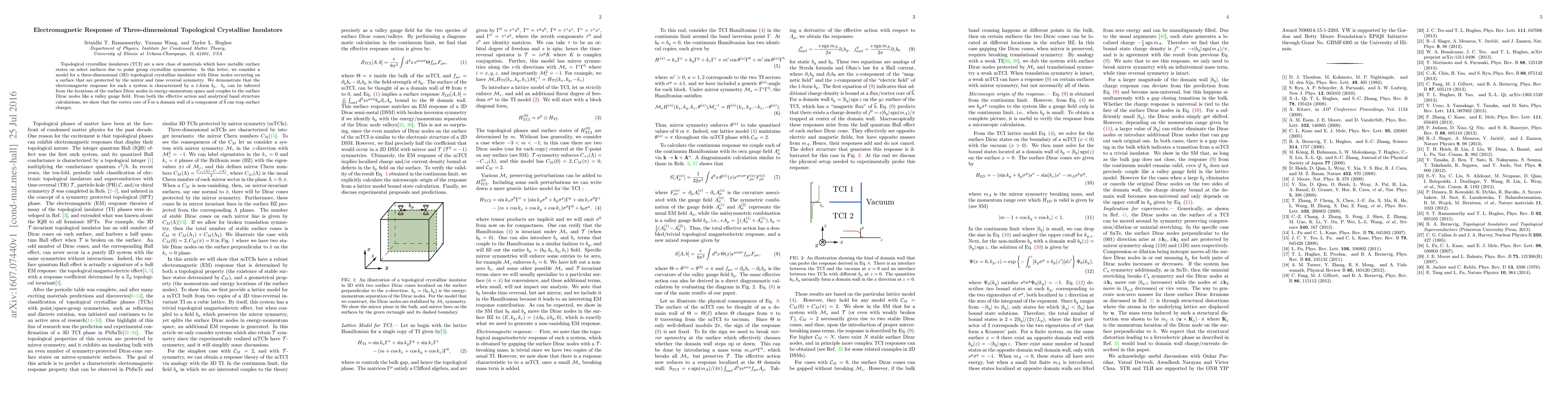 This paper investigates the electromagnetic response of three-dimensional topological crystalline insulators, revealing that the system is characterized by a $1$-form $b_{\mu}$ which couples to surface Dirac nodes. The study shows that vortex cores of $\vec b$ can trap surface charges, highlighting unique electromagnetic properties.