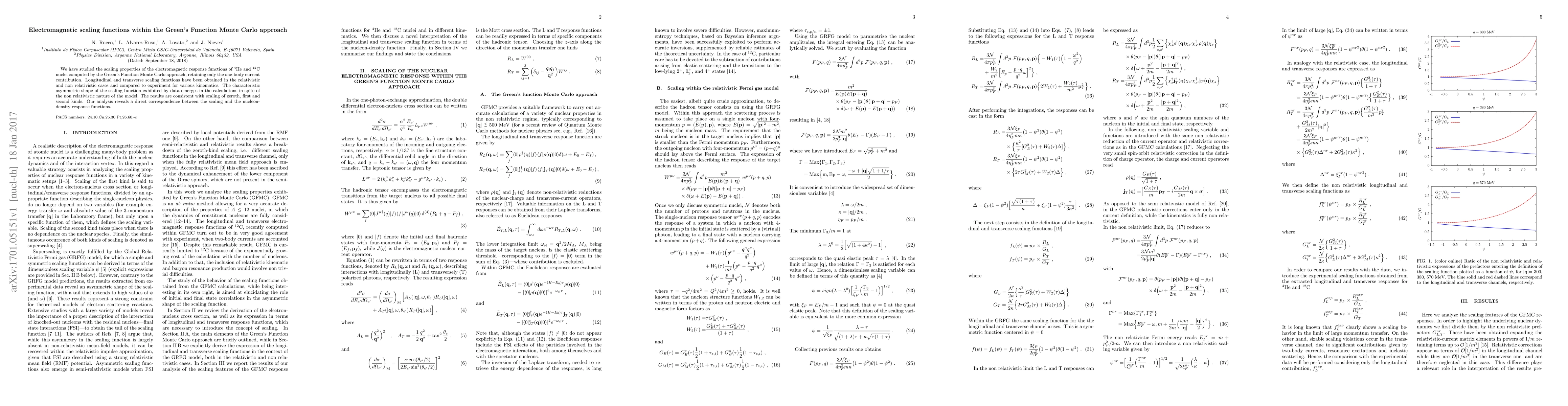 This paper investigates the electromagnetic response functions of $^4$He and $^{12}$C nuclei using the Green's Function Monte Carlo approach, focusing on one-body current contributions. The study reveals consistent scaling behaviors across relativistic and non-relativistic models, highlighting a correspondence between scaling functions and nucleon-density response functions.