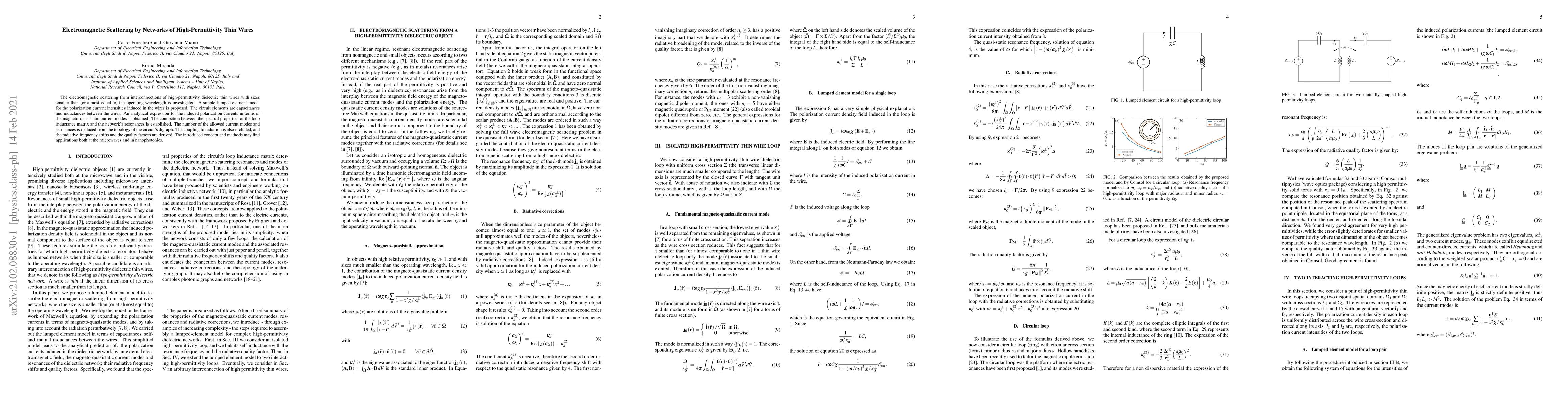 The electromagnetic scattering from interconnections of high-permittivity dielectric thin wires with sizes smaller than (or almost equal to) the operating wavelength is investigated. A simple lumped element model for the polarization current intensities induced in the wires is proposed. The circuit elements are capacitances and inductances between the wires. An analytical expression for the induced polarization currents in terms of the magneto-quasistatic current modes is obtained. The connection between the spectral properties of the loop inductance matrix and the network's resonances is established. The number of the allowed current modes and resonances is deduced from the topology of the circuit's digraph. The coupling to radiation is also included, and the radiative frequency shifts and the quality factors are derived. The introduced concept and methods may find applications both at the microwaves and in nanophotonics.