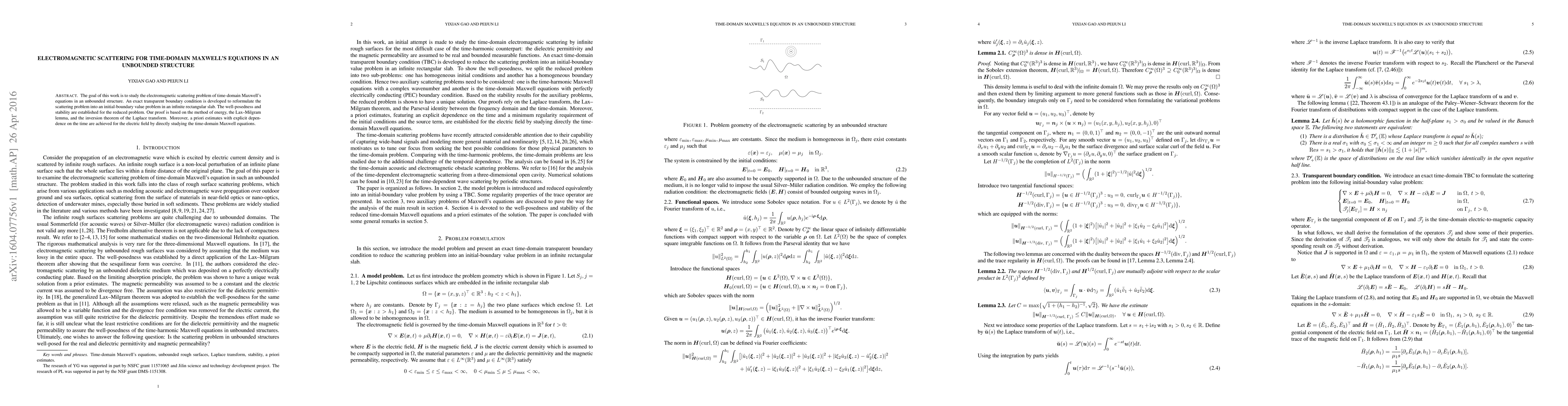 This paper develops an exact transparent boundary condition to reformulate electromagnetic scattering problems governed by time-domain Maxwell's equations in an infinite structure. The method ensures well-posedness and stability, with a priori estimates for the electric field derived through the method of energy and the Lax-Milgram lemma.