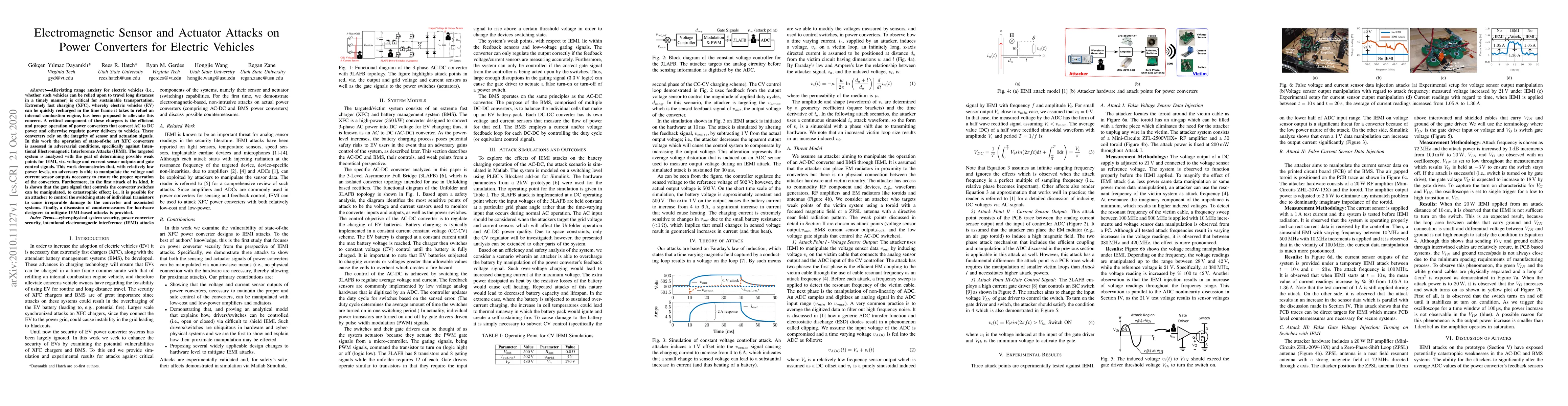 This paper investigates the vulnerabilities of power converters in electric vehicle fast chargers to intentional electromagnetic interference attacks, demonstrating how low-power manipulations can disrupt voltage and current sensors and control gate signals, potentially causing severe damage. It also proposes countermeasures for hardware designers to enhance resilience against such attacks.