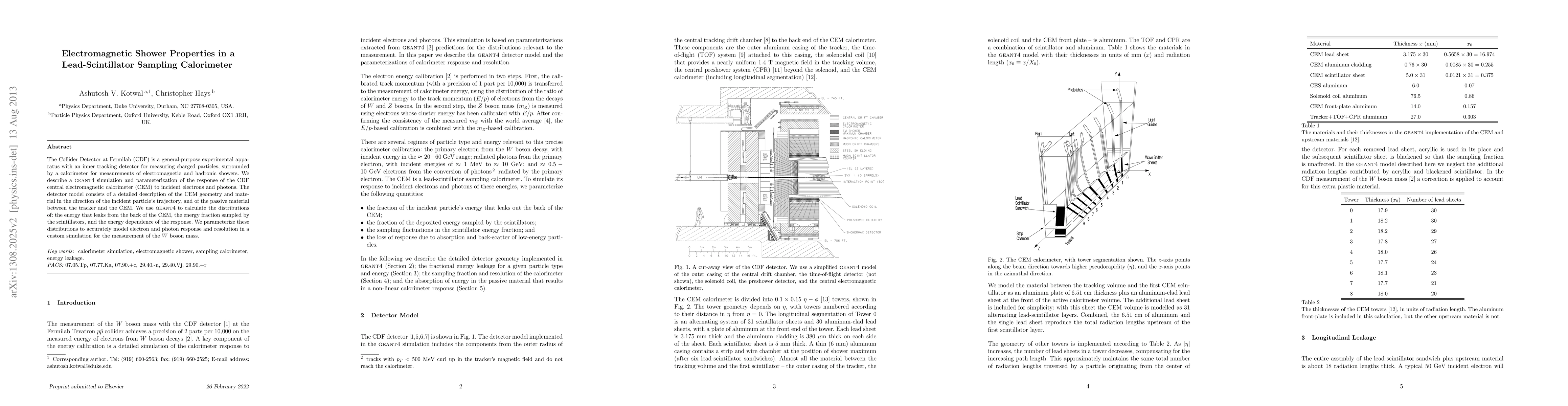 This paper presents a detailed {\sc geant4} simulation and parameterization of the CDF central electromagnetic calorimeter (CEM) for measuring electromagnetic showers, focusing on electron and photon response. The study calculates the energy leakage and fraction sampled by scintillators, aiming to accurately model the CEM's response for $W$ boson mass measurements.