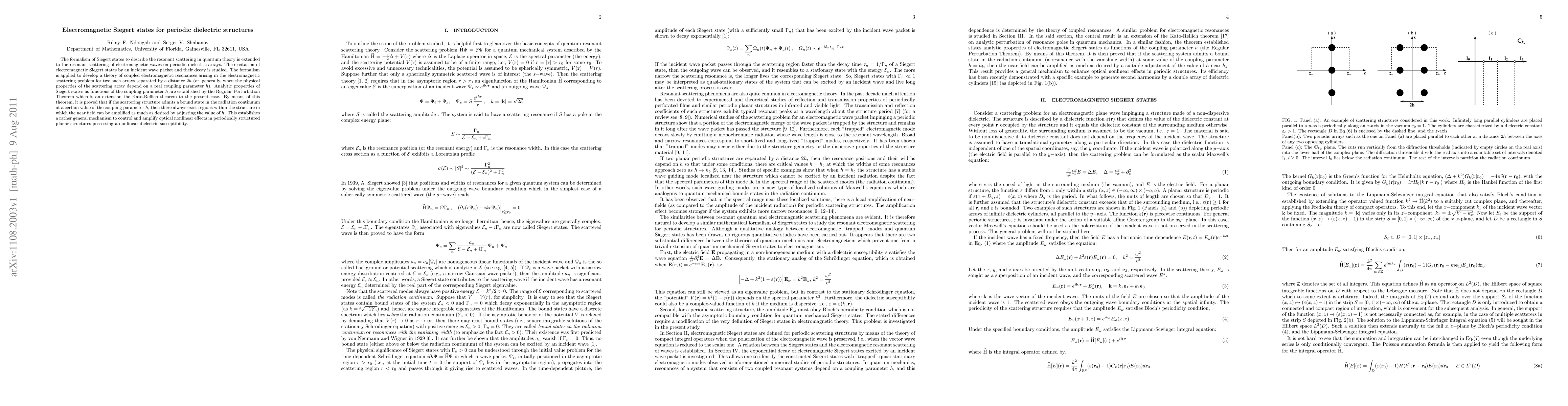 This paper extends the Siegert states formalism to electromagnetic waves scattering in periodic dielectric arrays, studying their excitation and decay. It develops a theory for coupled electromagnetic resonances and proves a mechanism to amplify near fields and control optical nonlinear effects in such structures via a Regular Perturbation Theorem.