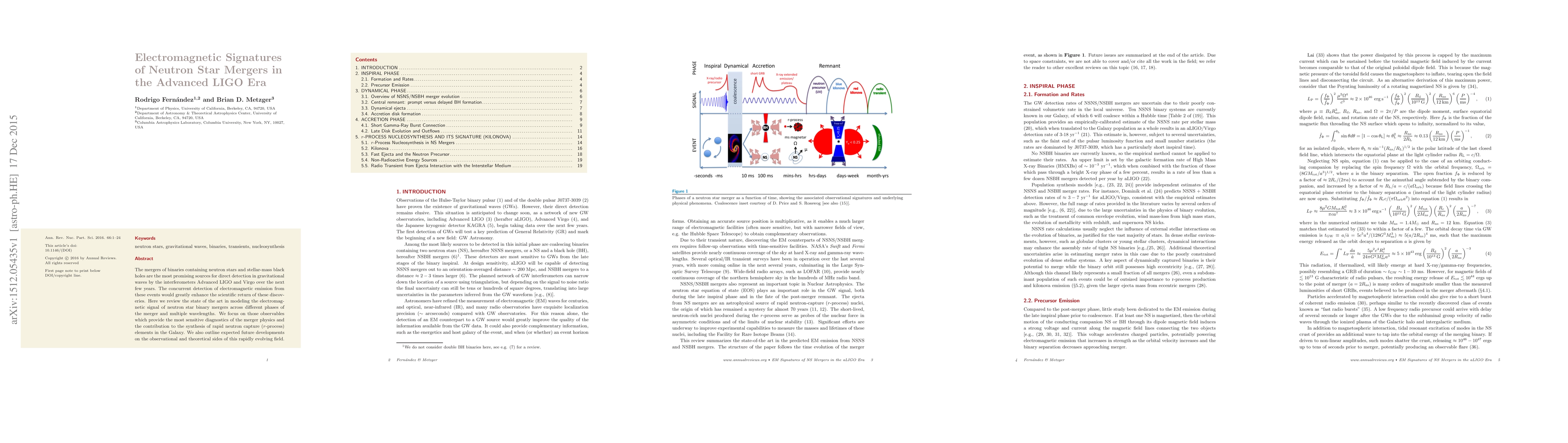 This paper reviews modeling of electromagnetic signals from neutron star mergers, aiming to enhance detection with gravitational waves and understand element synthesis in the Galaxy. It outlines future developments for a rapidly evolving field, providing insights into merger physics and r-process elements.