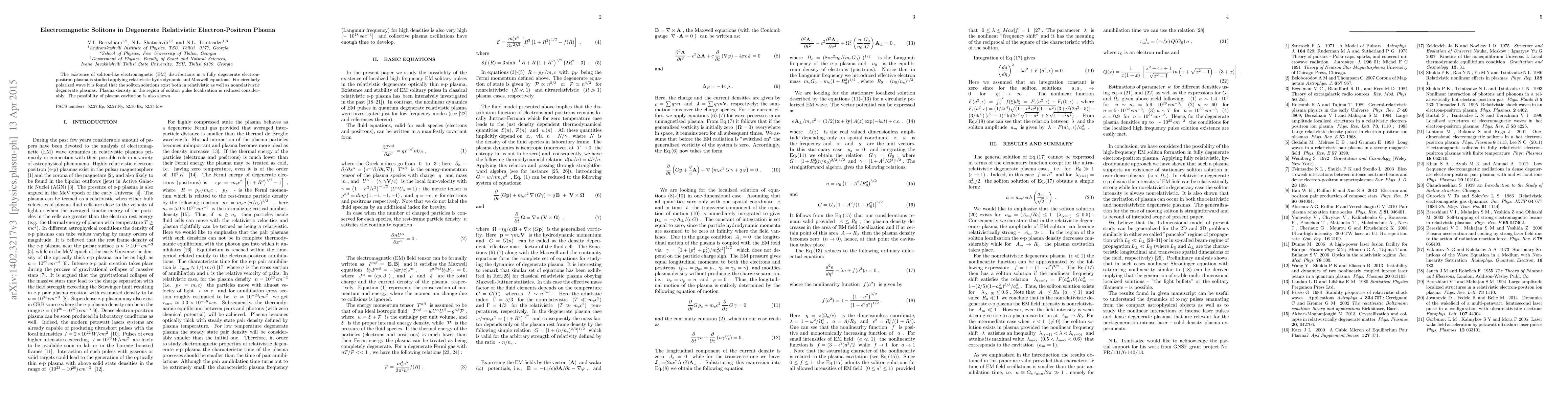 This paper investigates soliton-like electromagnetic distributions in degenerate relativistic electron-positron plasmas using relativistic hydrodynamics and Maxwell equations, revealing soliton solutions in both relativistic and nonrelativistic degenerate plasmas, with significant plasma density reduction in soliton regions, suggesting the possibility of plasma cavitation.
