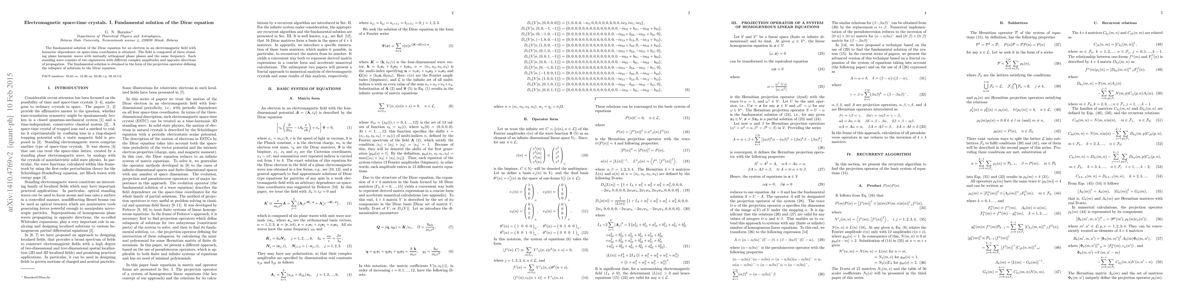 The fundamental solution of the Dirac equation for an electron in an electromagnetic field with harmonic dependence on space-time coordinates is obtained. The field is composed of three standing plane harmonic waves with mutually orthogonal phase planes and the same frequency. Each standing wave consists of two eigenwaves with different complex amplitudes and opposite directions of propagation. The fundamental solution is obtained in the form of the projection operator defining the subspace of solutions to the Dirac equation.