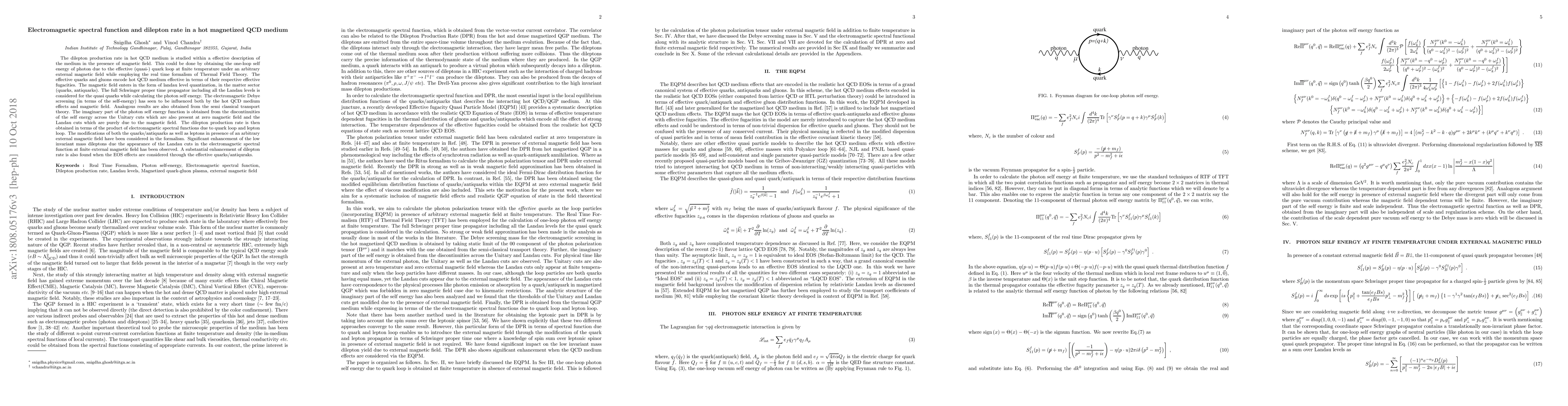The dilepton production rate in hot QCD medium is studied within a effective description of the medium in the presence of magnetic field. This could be done by obtaining the one-loop self energy of photon due to the effective (quasi-) quark loop at finite temperature under an arbitrary external magnetic field while employing the real time formalism of Thermal Field Theory. The effective quarks and gluons encode hot QCD medium effective in terms of their respective effective fugacities. The magnetic field enters in the form of landau level quantization, in the matter sector (quarks, antiquarks). The full Schwinger proper time propagator including all the Landau levels is considered for the quasi quarks while calculating the photon self energy. The electromagnetic Debye screening (in terms of the self-energy) has seen to be influenced both by the hot QCD medium effects and magnetic field. Analogous results are also obtained from the semi classical transport theory. The imaginary part of the photon self energy function is obtained from the discontinuities of the self energy across the Unitary cuts which are also present at zero magnetic field and the Landau cuts which are purely due to the magnetic field. The dilepton production rate is then obtained in terms of the product of electromagnetic spectral functions due to quark loop and lepton loop. The modifications of both the quarks/antiquarks as well as leptons in presence of an arbitrary external magnetic field have been considered in the formalism. Significant enhancement of the low invariant mass dileptons due the appearance of the Landau cuts in the electromagnetic spectral function at finite external magnetic field has been observed. A substantial enhancement of dilepton rate is also found when the EOS effects are considered through the effective quarks/antiquraks.