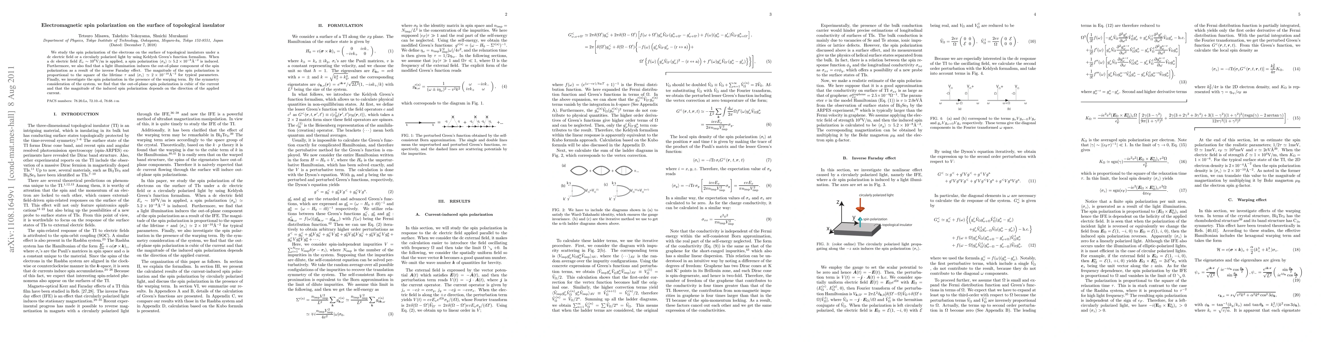 We study the spin polarization of the electrons on the surface of topological insulators under a dc electric field or a circularly polarized light by using Keldysh Green's function formalism. When a dc electric field $E_x \sim 10^{3} {\rm V/m}$ is applied, a spin polarization $<\sigma_{y}> \simeq 5.2 \times 10^{-8}{\rm \AA^{-2}}$ is induced. Furthermore, we also find that a light illumination induces the out-of-plane component of the spin polarization as a result of the inverse Faraday effect. The magnitude of the spin polarization is proportional to the square of the lifetime $\tau$ and $<\sigma_{z}> \simeq 2 \times 10^{-10}{\rm \AA^{-2}}$ for typical parameters. Finally, we investigate the spin polarization in the presence of the warping term. By the symmetry consideration of the system, we find that the out-of-plane spin polarization is cubic of the current and that the magnitude of the induced spin polarization depends on the direction of the applied current.