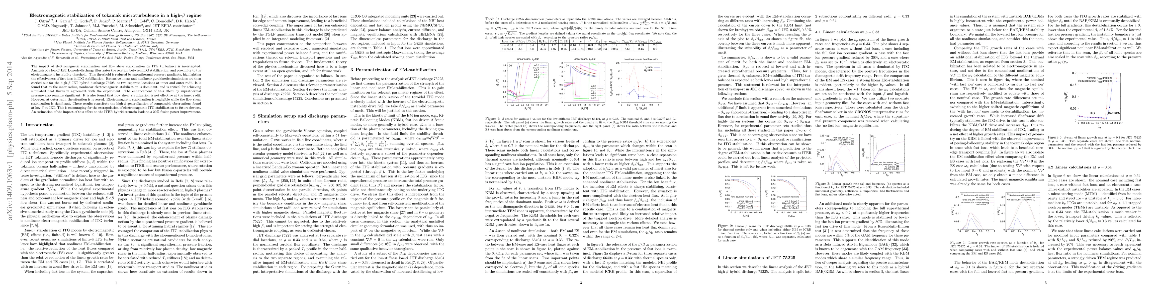 The impact of electromagnetic stabilization and flow shear stabilization on ITG turbulence is investigated. Analysis of a low-$\beta$ JET L-mode discharge illustrates the relation between ITG stabilization, and proximity to the electromagnetic instability threshold. This threshold is reduced by suprathermal pressure gradients, highlighting the effectiveness of fast ions in ITG stabilization. Extensive linear and nonlinear gyrokinetic simulations are then carried out for the high-$\beta$ JET hybrid discharge 75225, at two separate locations at inner and outer radii. It is found that at the inner radius, nonlinear electromagnetic stabilization is dominant, and is critical for achieving simulated heat fluxes in agreement with the experiment. The enhancement of this effect by suprathermal pressure also remains significant. It is also found that flow shear stabilization is not effective at the inner radii. However, at outer radii the situation is reversed. Electromagnetic stabilization is negligible while the flow shear stabilization is significant. These results constitute the high-$\beta$ generalization of comparable observations found at low-$\beta$ at JET. This is encouraging for the extrapolation of electromagnetic ITG stabilization to future devices. An estimation of the impact of this effect on the ITER hybrid scenario leads to a 20% fusion power improvement.