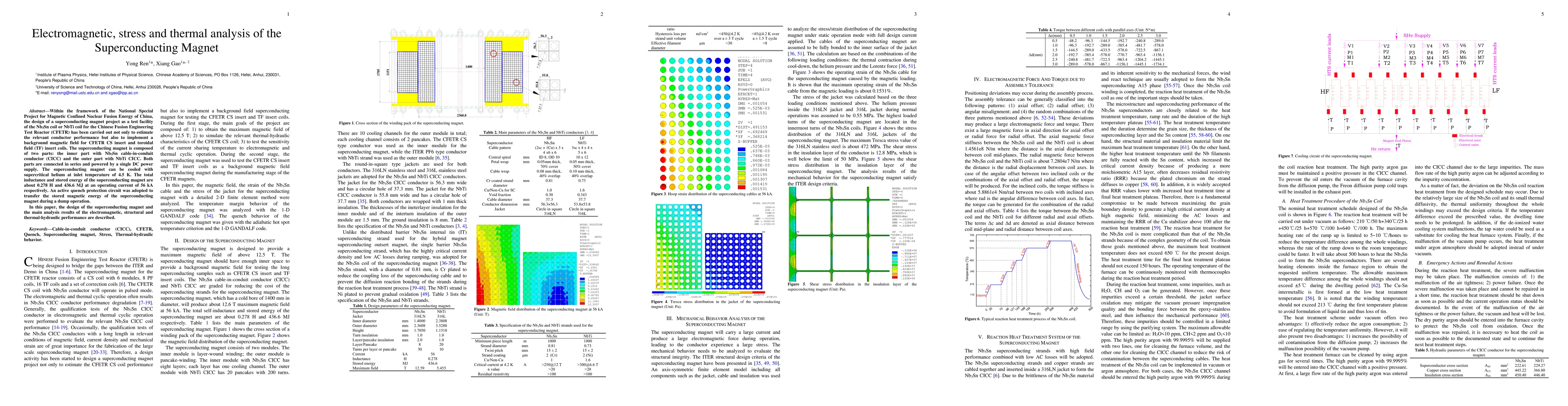 This paper details the design of a superconducting magnet for the Chinese Fusion Engineering Test Reactor, focusing on electromagnetic, stress, and thermal analysis. The magnet uses Nb3Sn and NbTi cable-in-conduit conductors, with an active quench protection circuit, and stores significant energy at high currents.