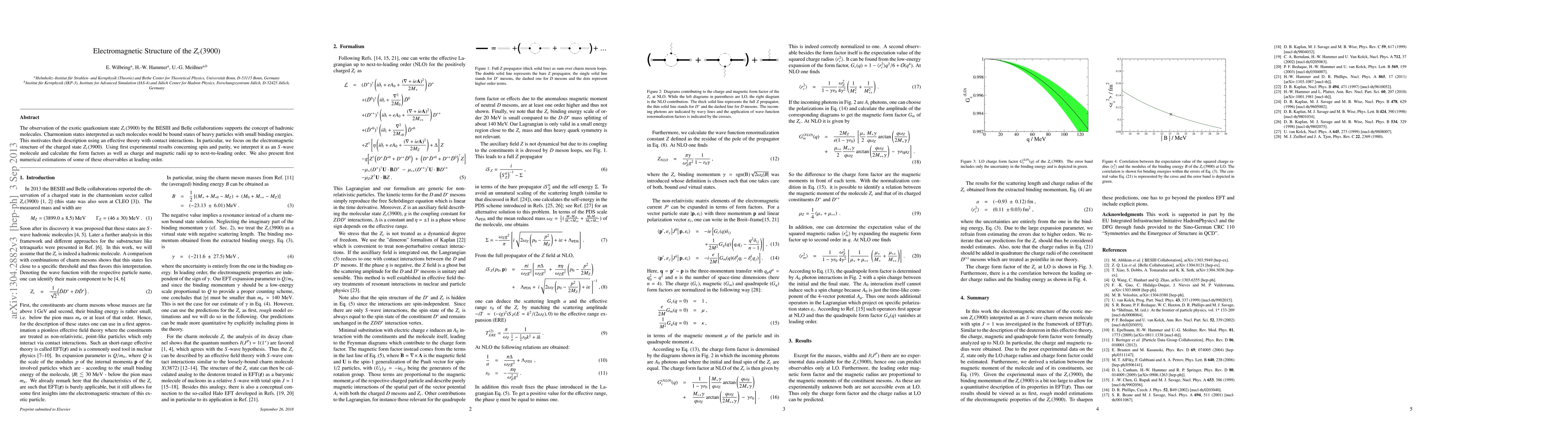 The observation of the exotic quarkonium state Z_c(3900) by the BESIII and Belle collaborations supports the concept of hadronic molecules. Charmonium states interpreted as such molecules would be bound states of heavy particles with small binding energies. This motivates their description using an effective theory with contact interactions. In particular, we focus on the electromagnetic structure of the charged state Z_c(3900). Using first experimental results concerning spin and parity, we interpret it as an S-wave molecule and calculate the form factors as well as charge and magnetic radii up to next-to-leading order. We also present first numerical estimations of some of these observables at leading order.
