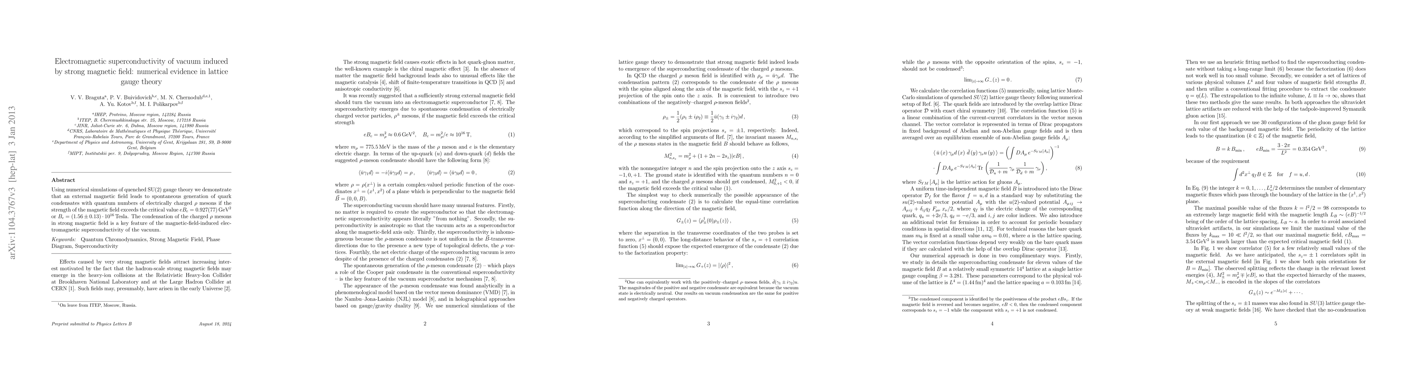 This study uses lattice gauge theory simulations to show that a strong magnetic field can induce electromagnetic superconductivity in the vacuum, leading to the spontaneous generation of quark condensates with the quantum numbers of electrically charged rho mesons when the magnetic field exceeds a critical strength of approximately 1.56 x 10^16 Tesla.